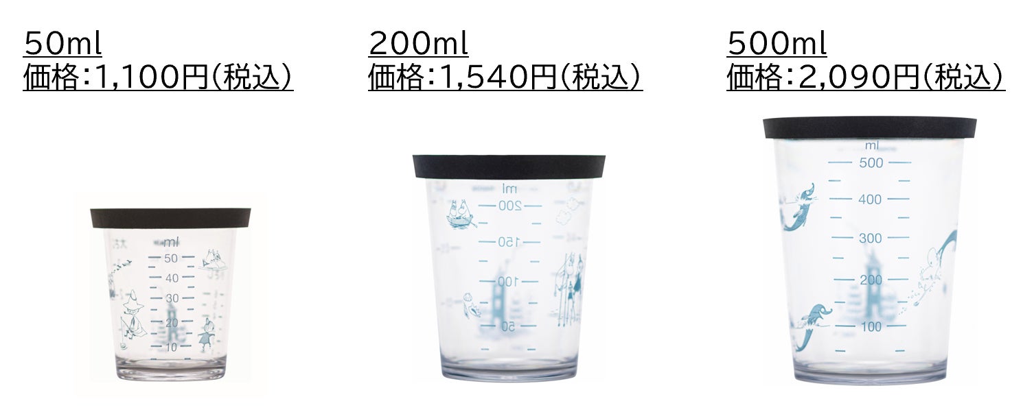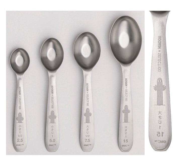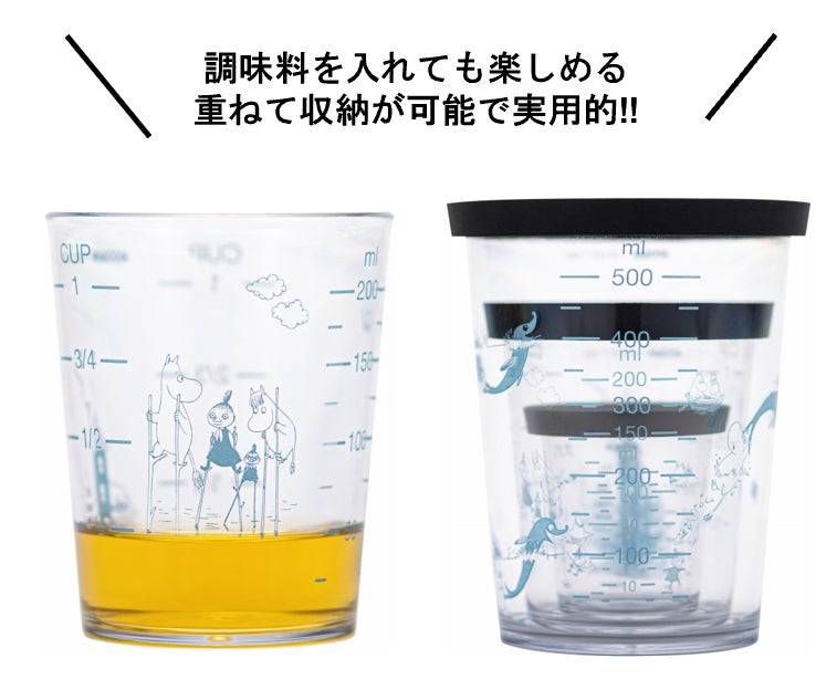 ムーミン谷の仲間たちのデザインがそれぞれの計量カップにデザインされており、計量カップの中に調味料を入れると、デザインとの調和を楽しむことができます。