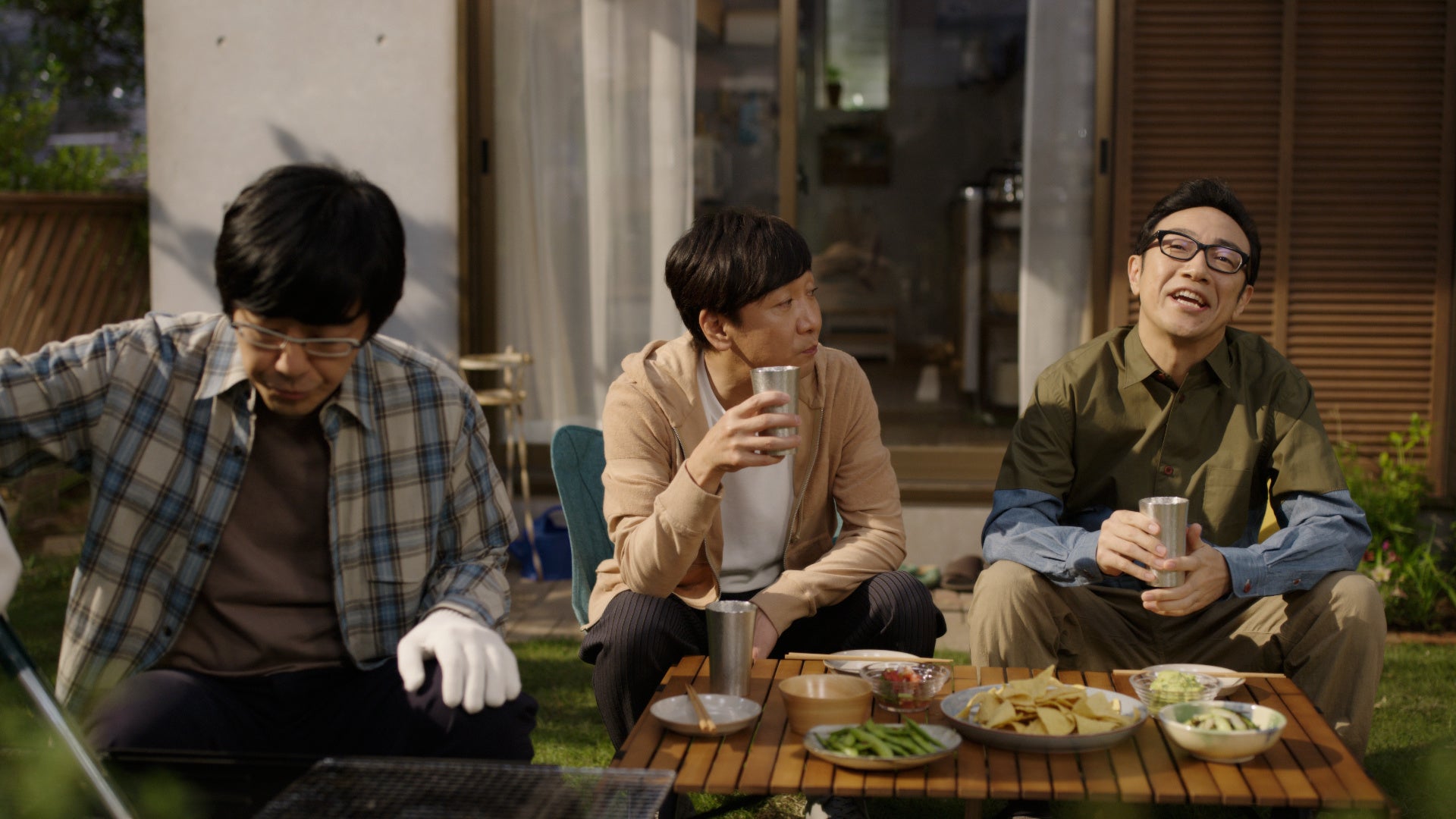 豊本さん宅の庭にご当地の醤油を使った料理が並ぶなか、「品のいい醤油」と飯塚さん。「いろんなとこから“さとふる”してます」「うまいし楽しいし」と豊本さん麻生さん夫妻が、ふるさと納税でご当地の醤油を楽しんでいることを話します。そこに角田さんが「醤油って個性でるよね」と言うと、飯塚さんがテンポよく「この醤油の個性は、一言で言うと?」と振ります。「無骨大名」と角田さんが返し、笑いが起こるなかストーリーが終わります。