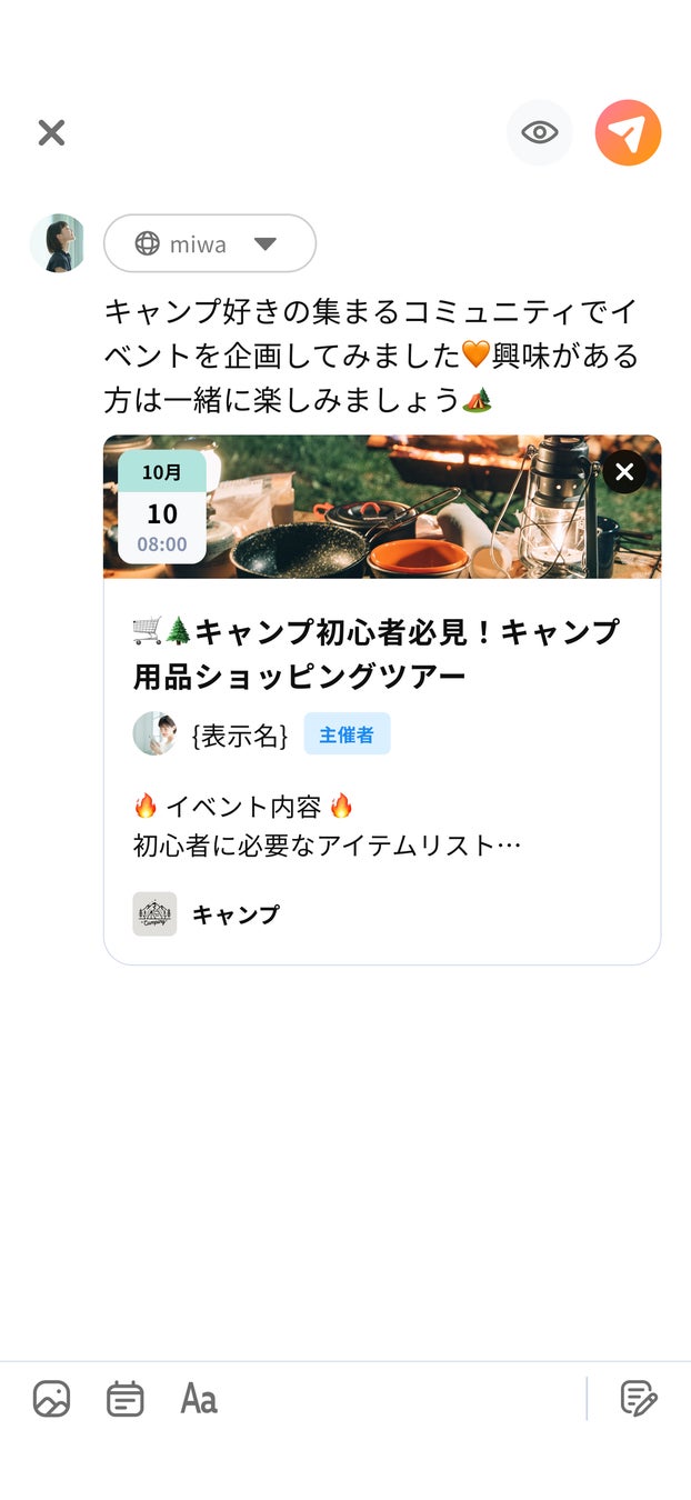 同じアニメ作品やスポーツ中継を同時に見ながら投稿する「オンラインイベント」や、一緒にキャンプに行く約束をする「オフラインイベント」を作成できます。