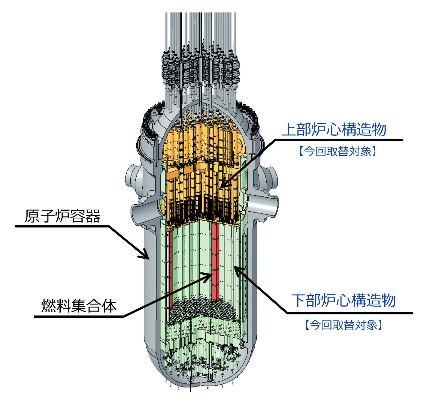 炉内構造物は、全長約10m、外径約4m、重量約130トンのステンレス製で、燃料集合体を収納する下部炉心構造物と、それを上部から支持する上部炉心構造物で構成されます。今回製造する炉内構造物は、長期的な信頼性向上の観点から、海外において発生事例があるボルト損傷への対策を施すなどの最新設計を取り入れ、一体取替を実施する予定です。