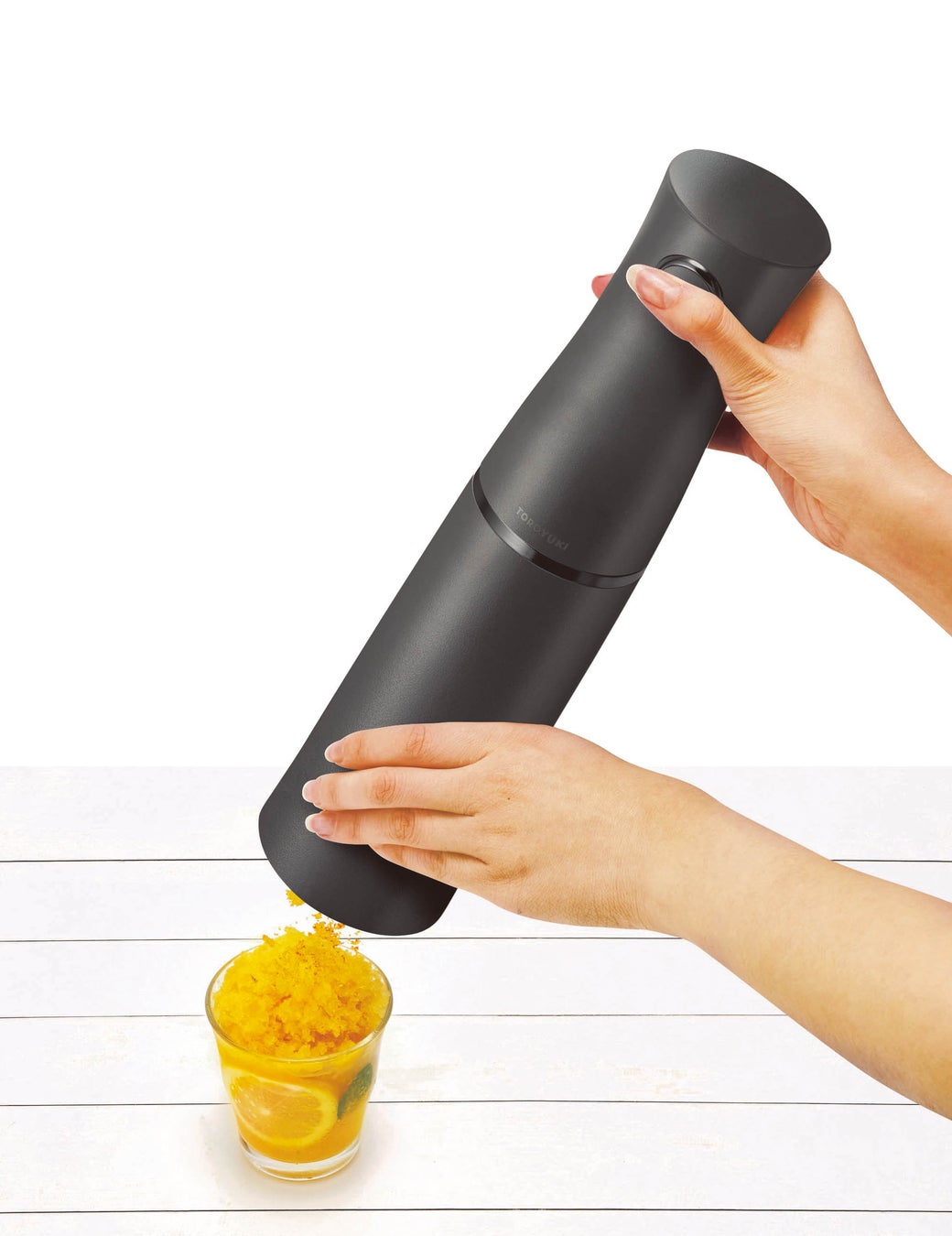 本製品は累計販売台数が2022年に、100万台を超えたロングセラー製品「電動ふわふわ とろ雪かき氷器」シリーズの、スティックタイプかき氷器「電動ふわふわ とろ雪スティックかき氷器」をリニューアルし、新カラーで展開します。水だけでできた氷と、ジュースなどで作った糖度の高い柔らかい氷以外に、刃の素材を見直すことで、冷凍したフルーツも削れるようになりました。本体カラーもブラックとグレーの中間の色を採用することで、キッチンにもなじみやすいカラーリングです。