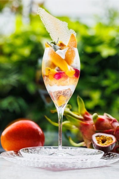 宮崎県産マンゴーをメインとし、ほかに彩りとしてドラゴンフルーツ、夏らしい味覚としてパッションフルーツを選びました。マンゴーはフレッシュのほか、ジェラートやソースに仕立てています。隠し味として、ライチのリキュールや蜂蜜なども要所にちりばめた、初夏にふさわしい味覚のパフェです。