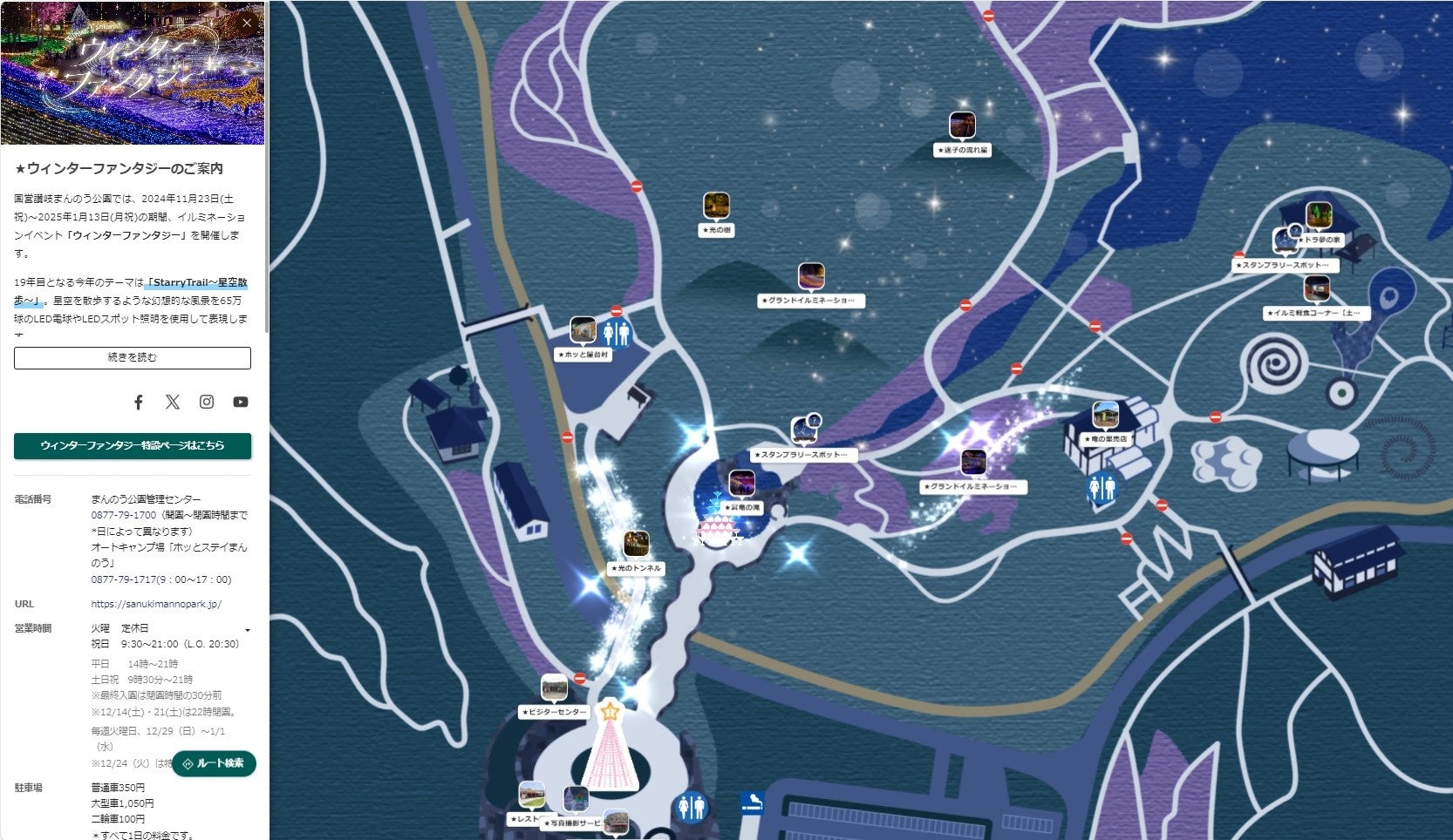 お手持ちのスマートフォンで使えるまんのう公園のデジタルマップに夜に便利なイルミネーションVerが登場!さらに公園の魅力が詰まった便利なマップをぜひご活用ください。