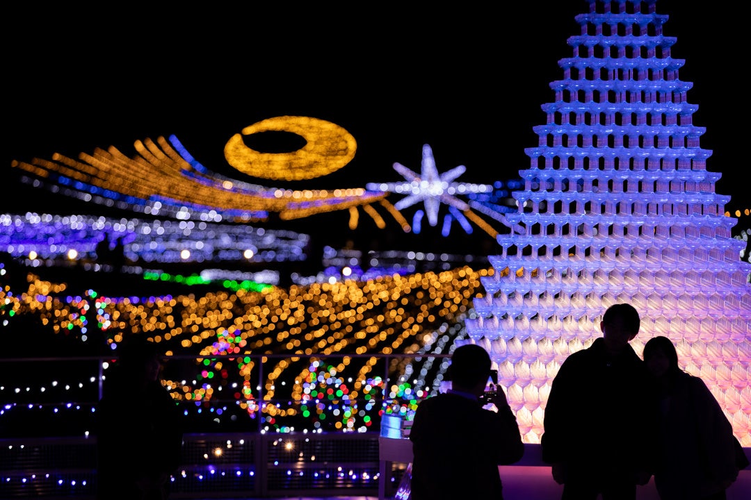 総面積約32,000平方メートルの大地に広がるグランドイルミネーションをはじめ、高さ10メートルのシンボルツリー、高さ5メートル4,900個のグラスを使用したシャンパングラスタワー、香川大学の学生の皆様のデザインによるグランドイルミネーションや、県内高校生の光の作品の展示も必見です。