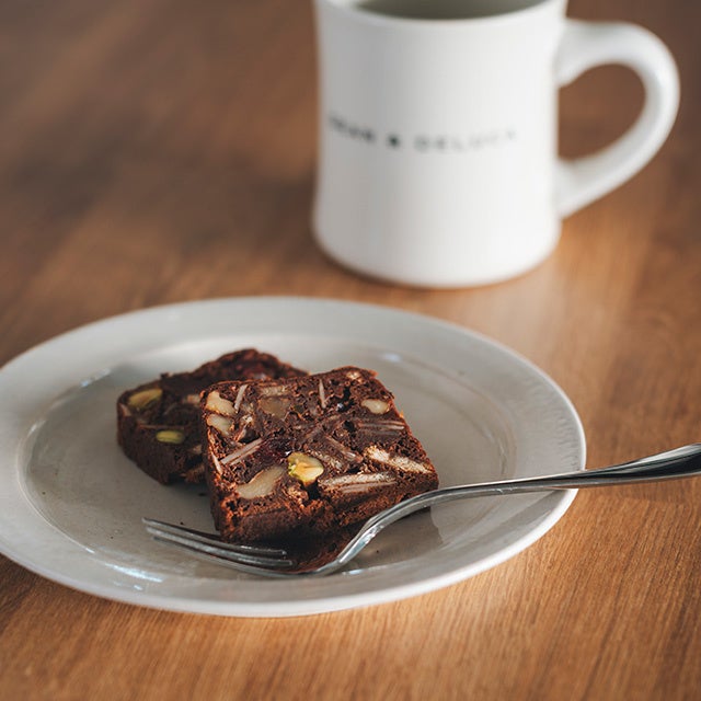 ハウスチョコレートで仕立てた生地に、アーモンド、くるみ、ピスタチオ、クランベリー、クラッカーがぎっしり。ポートワインとラム酒の芳醇さをほんのりきかせた生地は、ホットチョコレートと一緒にたのしめる控えめな甘さ。みんなでシェアしたり、独り占めにしたり、お好きな厚さにスライスしてお召し上がりください。