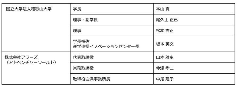 国立大学法人和歌山大学(学長:本山 貢、以下「和歌山大学」)と株式会社アワーズ(アドベンチャーワールド)は、幅広い分野における相互の地域交流の活性化を促し、産学が相互に連携協力することで、和歌山県の経済・産業の活性化、人材育成の推進を⽬的として、包括連携協定を締結いたします。