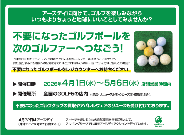 全国のゴルフ5店舗で使わなくなったゴルフボールを回収。