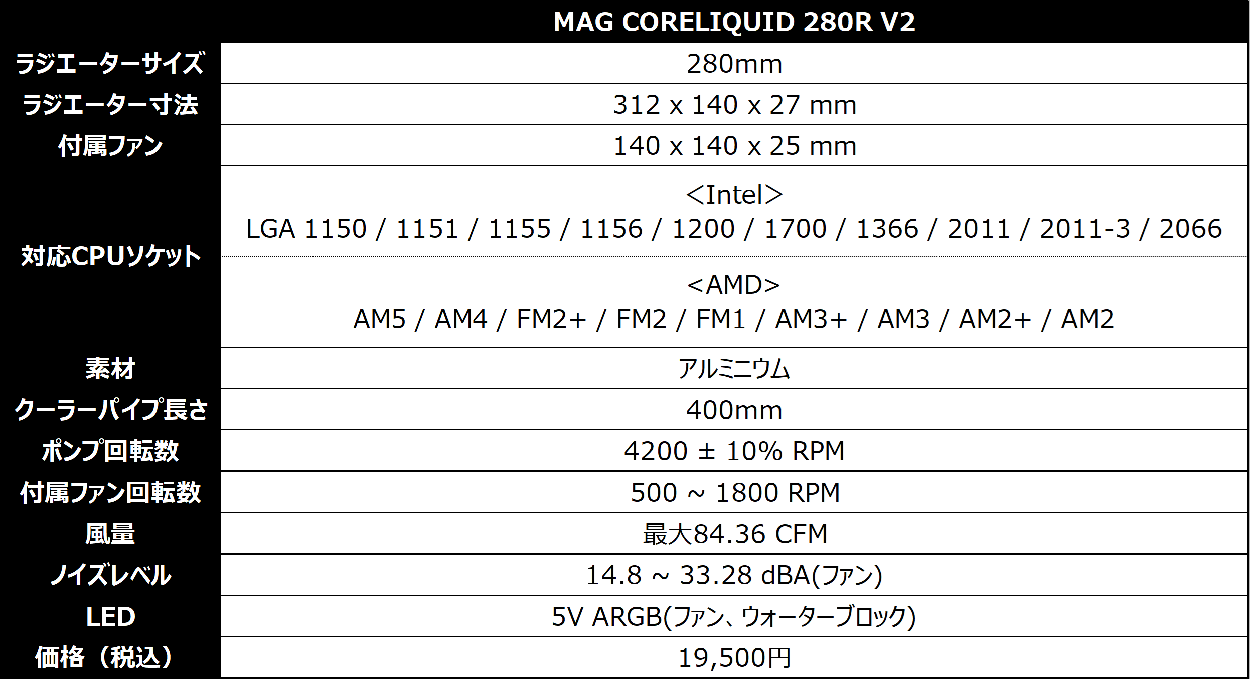 この度、エムエスアイコンピュータージャパン株式会社は、水冷CPUクーラー「MAG CORELIQUID 280R V2」を2022年11月4日(金)に発売いたします。価格は税込19,500円です。