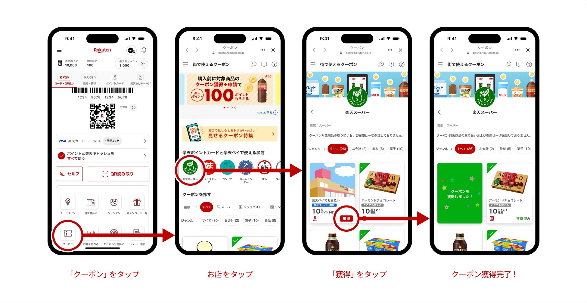 クーポン利用者は、「楽天ペイ」アプリのクーポンアイコンから、事前にクーポンを取得し、対象店舗にて条件(注)を満たしたうえで支払いをすることで、「楽天ポイント」を獲得できます。