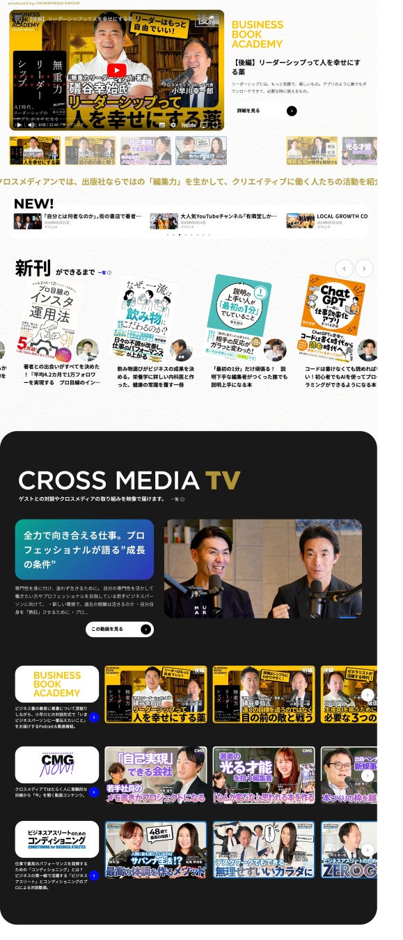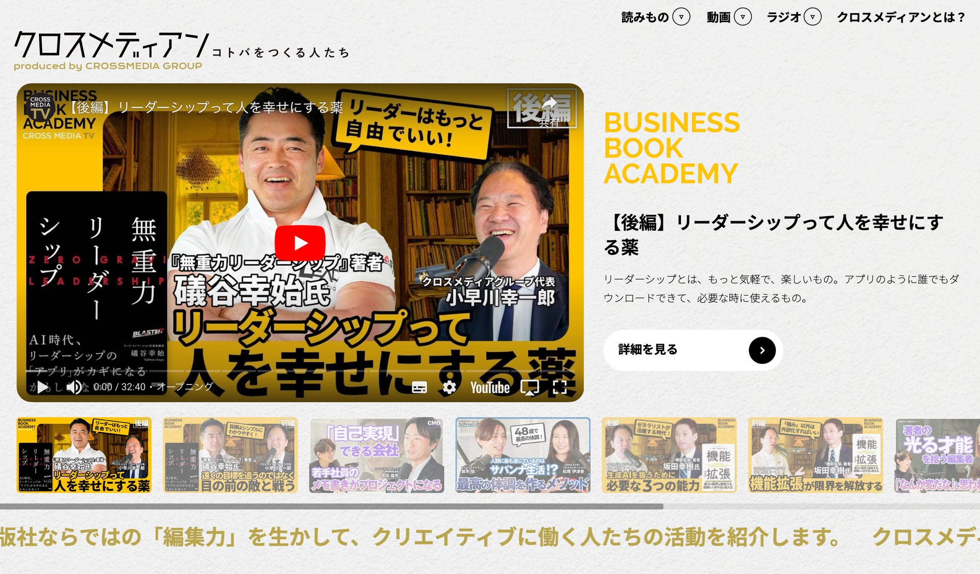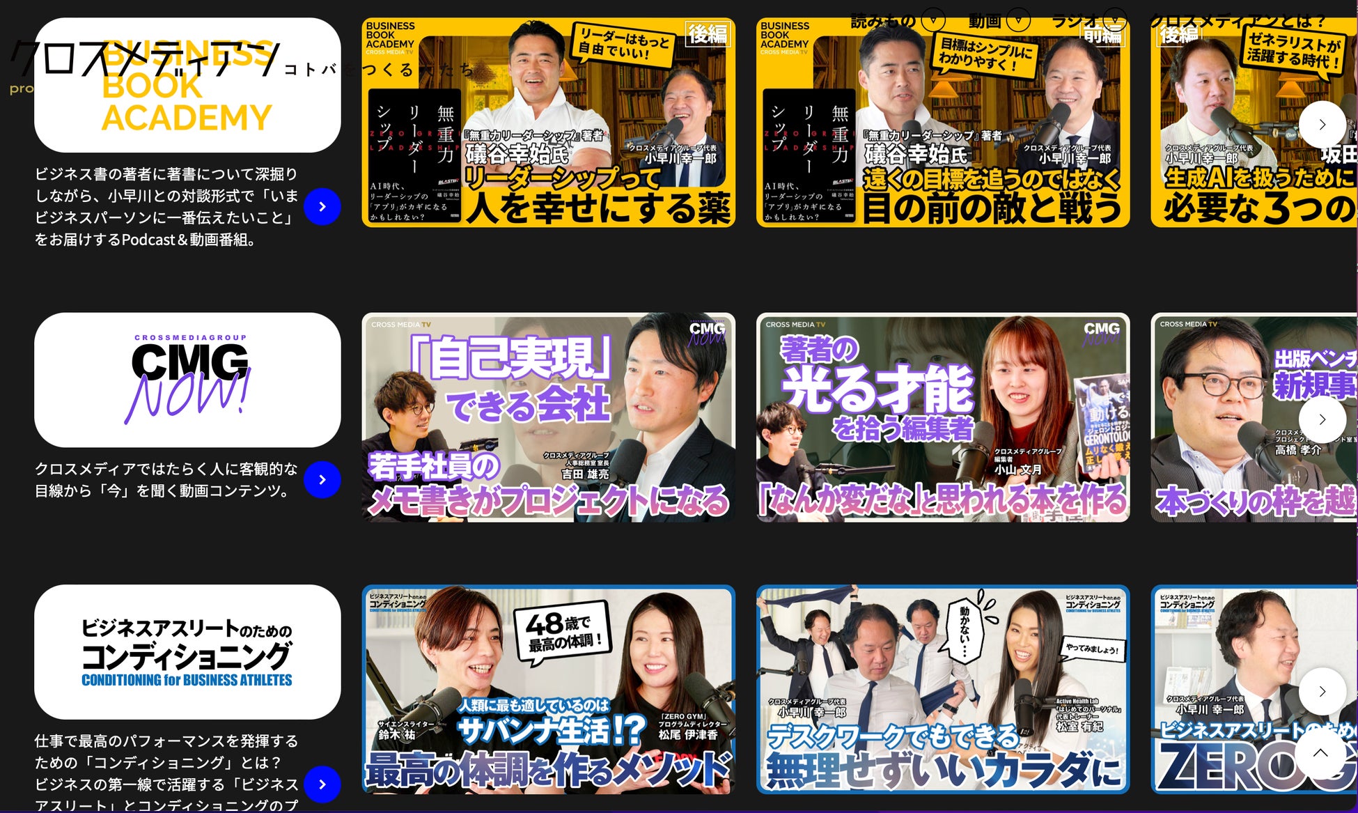 ビジネス書著者へのインタビュー動画「ビジネス・ブック・アカデミー」やクロスメディアの多様な社員スタッフが登場する「CMG NOW!」など、クロスメディアンでは様々な動画連載を配信しています。
