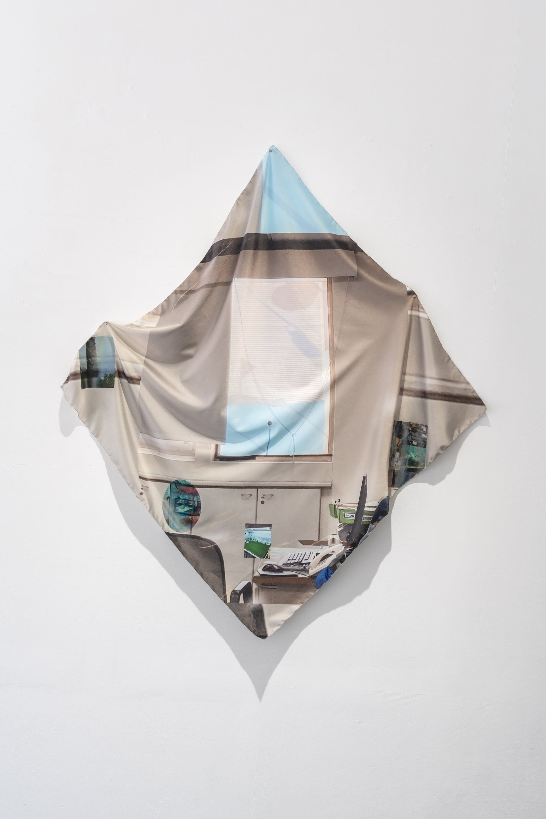 近年の制作では、『壁紙』というキーワードに引っかかり、ハンカチやバルーンといった既製品のボディをお借りしながら、主体・支持体と背景の関係性にどんどん着目。バルーンに少しだけ空気を入れて膨らませることや、風が作品をわずかに揺らすような、流動的で不安定な状態。日常の断片や秩序を少しぶらせつつ、プリントとリアルの差異を弄ぶように印刷することで、複製のあいだに生まれる“ズレ”を、ポジティブな揺らぎとして受けとめている。