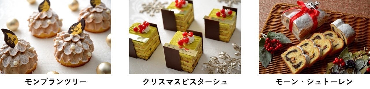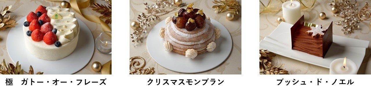 今年は、「極 ガトー・オー・フレーズ」のほか、赤×白×緑に彩られたクリスマスカラーのズコットに国産渋皮栗とマロングラッセを飾った「クリスマスモンブラン」、ブランデーを使用したムースショコラと雪の結晶を見立てたクッキーが印象的な大人の「ブッシュ・ド・ノエル」の3種をご用意いたしました。