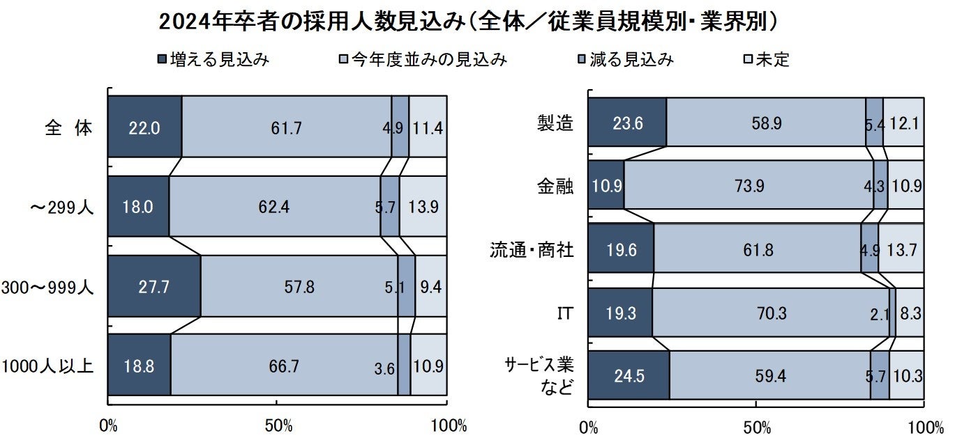 採用数「増える見込み」が22.0%で、「減る」(4.9%)を上回る。採用予算も増加傾向