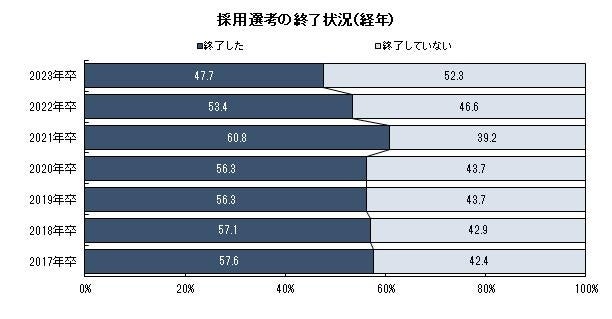 採用選考を「終了した」47.7%。2年連続で大きく低下。未終了企業の7割は予定外