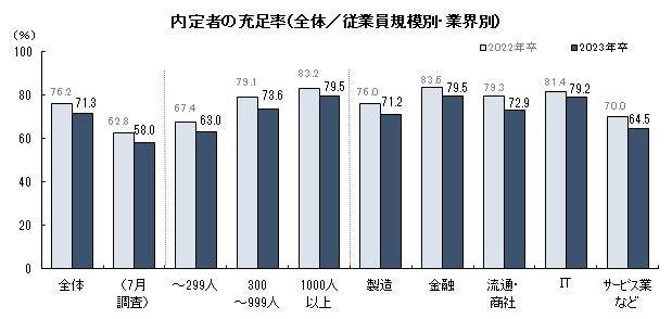 内定者充足率の平均は71.3%で、前年同期調査(76.2%)を下回りました