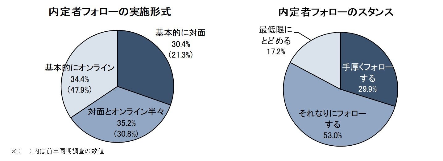 「基本的に対面」30.4%、「基本的にオンライン」34.4%。対面で実施する企業が増加