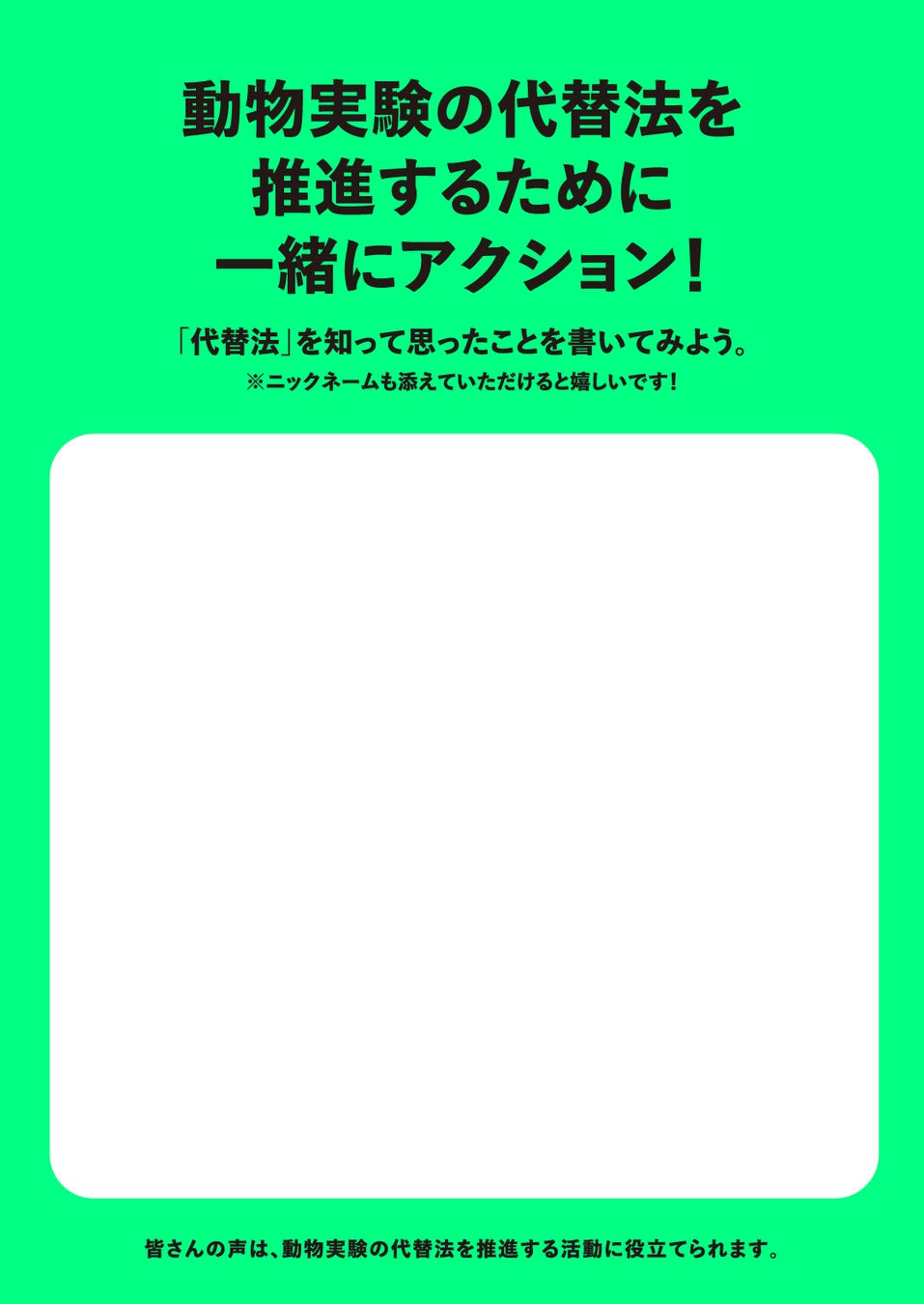 ・アクションボードの設置。お客様の賛同の声を可視化させることを狙います。動物実験の代替法のさらなる推進を求め、そのための法改正のための取り組みを後押しする声を集めます。