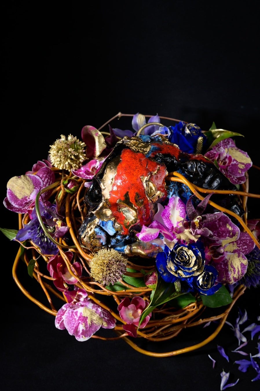 死を連想する髑髏の排他的な世界観にSJFのダイナミックで色彩鮮やかな瑞々しい生花を飾ることで、そこに矛盾した世界観を表現。見る者に違和感を敢えて与え、記憶に訴える新たなアートを届けます。