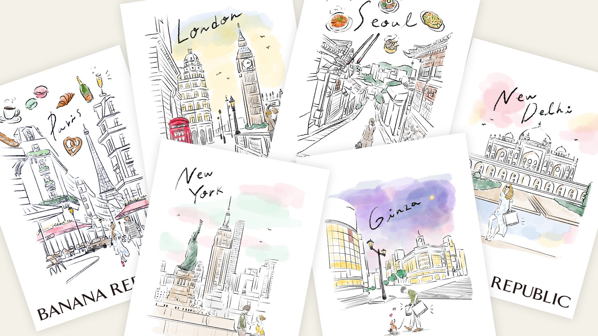 さらに、ご来場されたお客様全員に、銀座・ニューヨーク・パリ・ロンドン・ソウル・ニューデリーの6都市の街並みのイラストが描かれたオリジナルポストカードからお好きなものをプレゼントいたします。