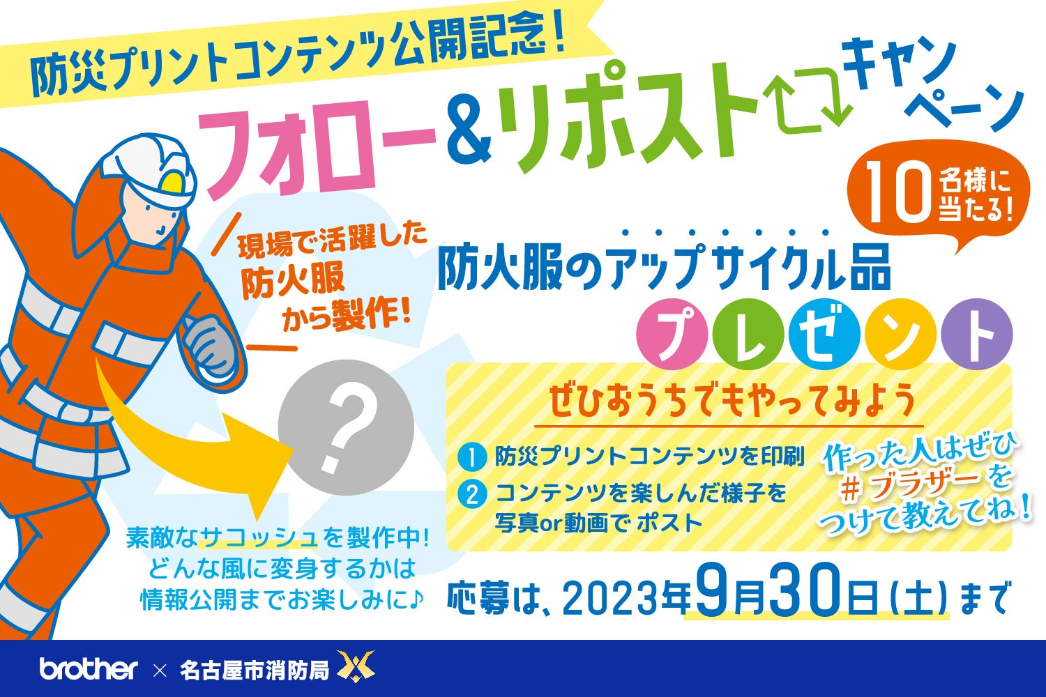 コンテンツの公開を記念して、公式SNSアカウントのフォローとリポストをした参加者から抽選で10人に、名古屋市消防局提供の防火服をアップサイクルしたオリジナルグッズをプレゼントするキャンペーンを開催する。