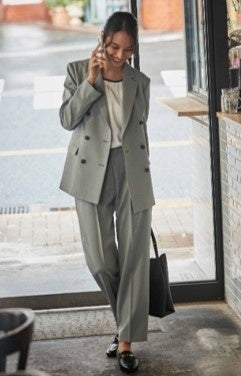 前回のスタイルをベースにしたカーキのダブルジャケットと、新しくタック入りのワイドパンツを展開。単品使いもしやすいスタイルです。