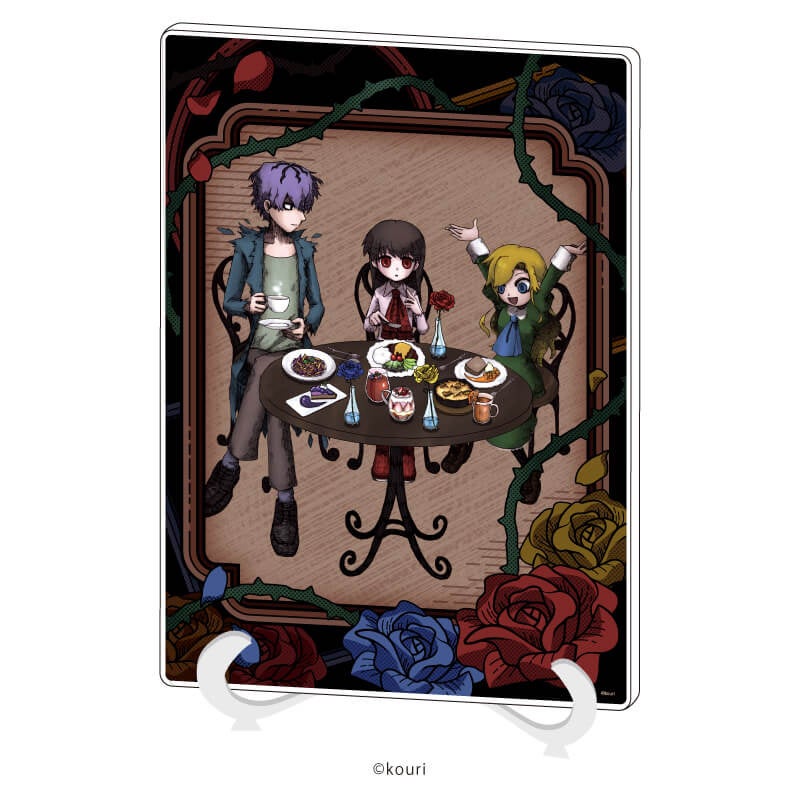 バラの蔦が巻きついたフレーム、絵の向こう側でテーブルを囲むイヴたち……そんな不思議なデザインのアクリルアートボードは、A5サイズ(およそ21cm×15cm)です。