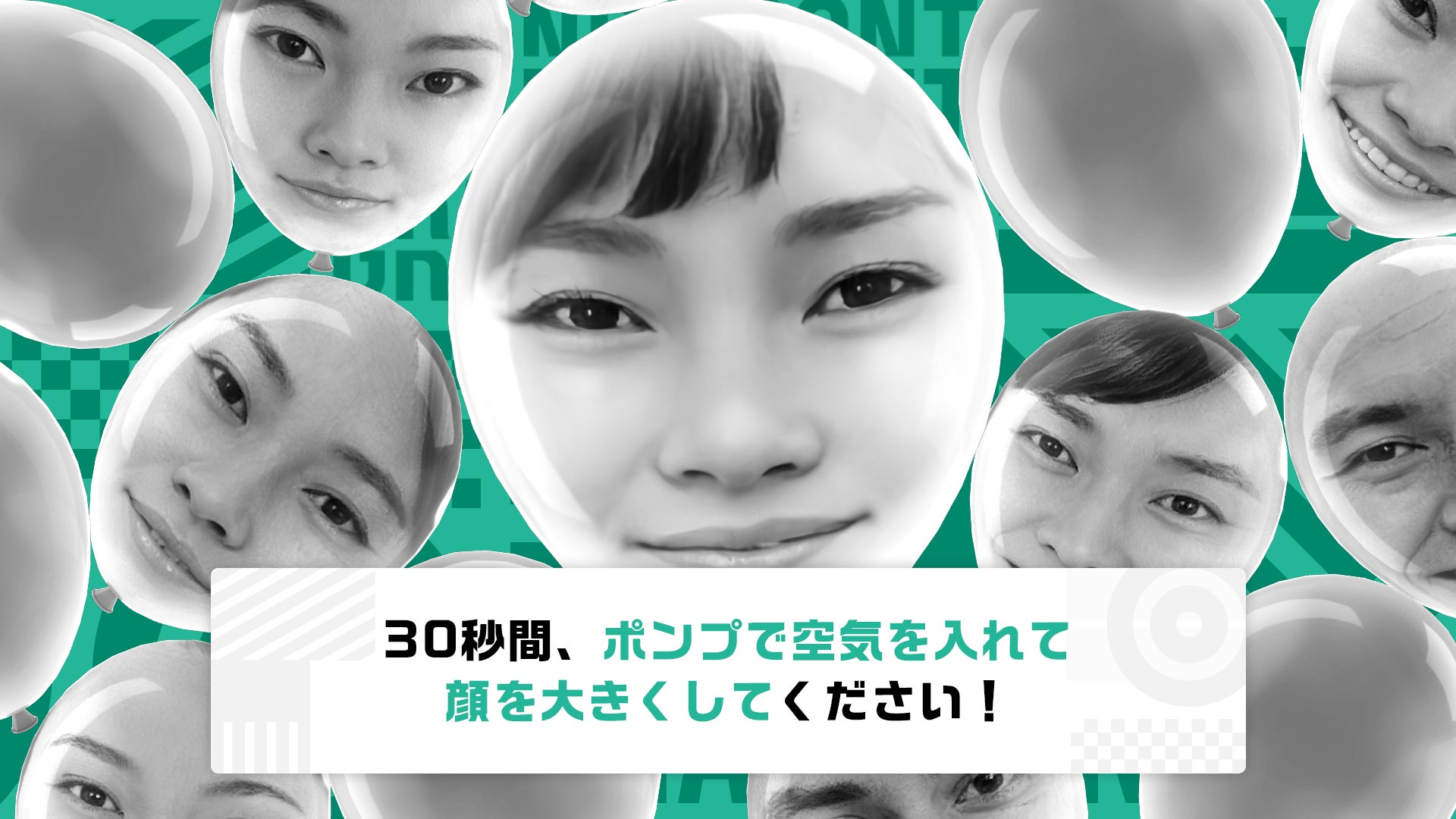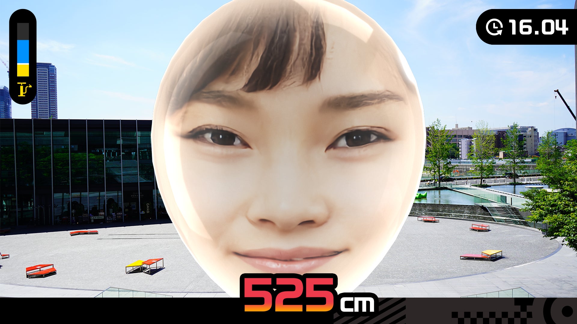競技ブースには、チーム代表者の顔を撮影し、競技用スクリーンに取り込む機械が設置されています。顔型バルーンがスクリーンに映し出されたら競技開始です。合図と共に、自転車の空気入れのようなポンプを全力で押すと、スクリーン上のバルーンに空気が入り、自分の顔がどんどん膨らんでいきます。制限時間30秒で膨らませられた顔型バルーンの大きさに応じて、得点をゲットできます。ポンプは3本用意されているため、1人で参加するよりも3人で空気を入れると有利です。顔の大きさに応じて背景もダイナミックに変化します。最初はグランフロント大阪を象徴する屋外スペース「うめきた広場」からスタートし、大きくなるとJR大阪駅が見え、頑張れば宇宙にも行くこともできます。自分の存在感をアピールしたくなるでしょう。