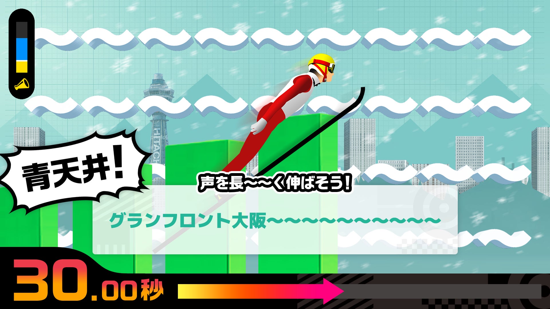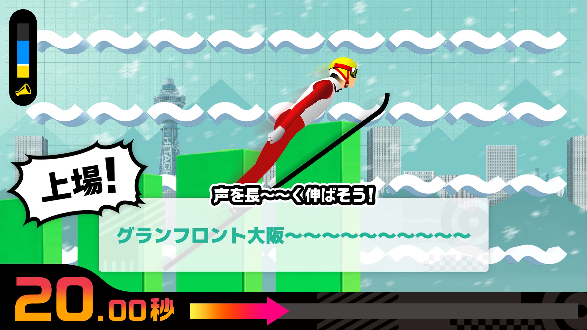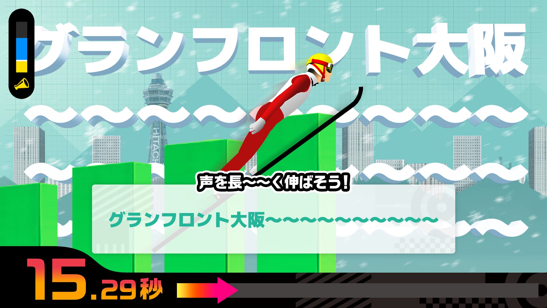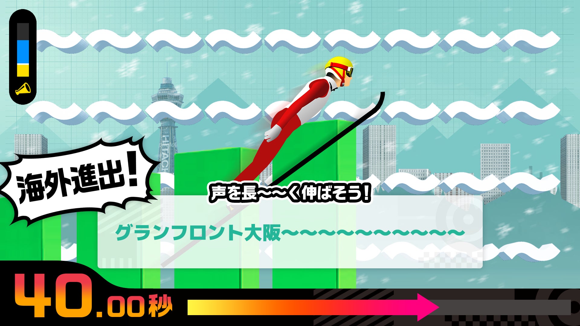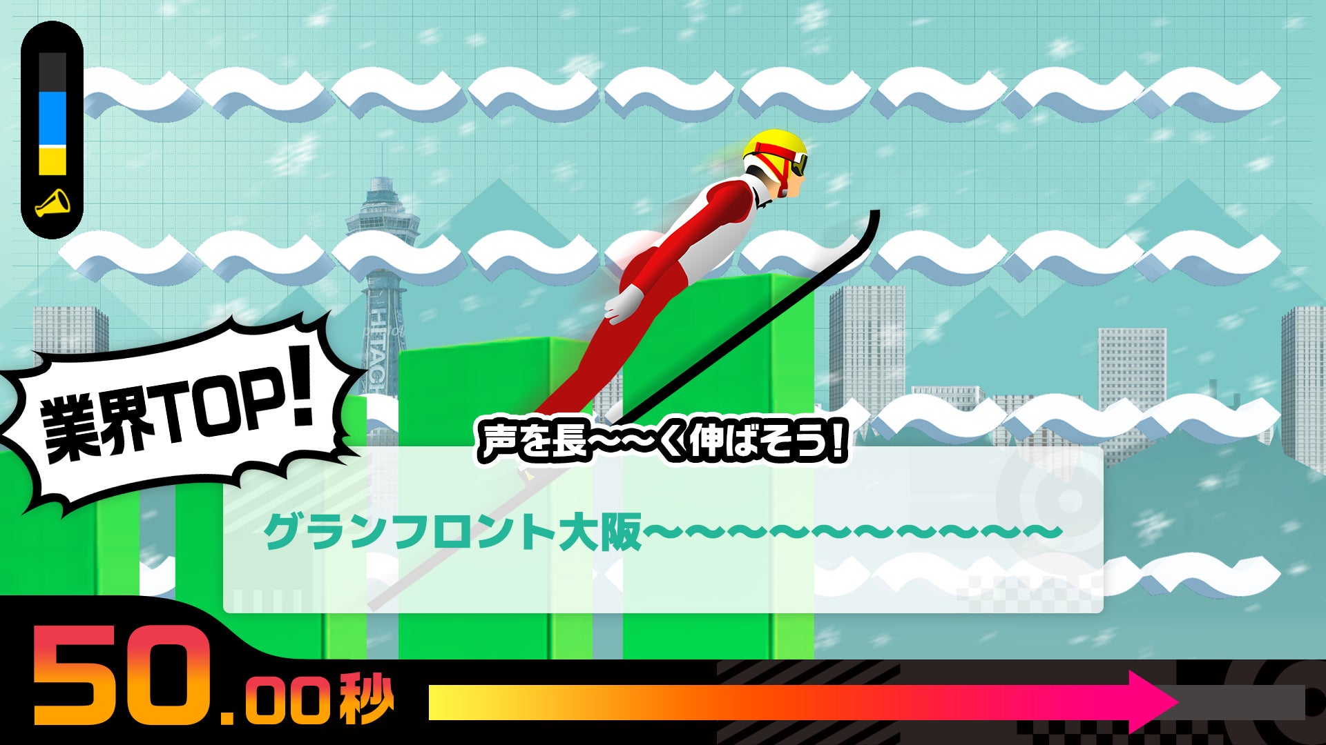 競技ブースには、メガホン型マイクと、スキー選手が映し出されたモニターが設置されています。挑戦者はマイクに向かい、愛を込めて自分の所属する会社や店舗名を声に出し続けます。その声の長さに応じてスキー選手の飛距離が伸びていく仕組みで、長くジャンプさせるほど高得点をゲットできます。ちなみに、飛び越えるのは雪山ではなく、右肩あがりの業績グラフです。業績を伸ばすためつい必死になってしまうことでしょう。