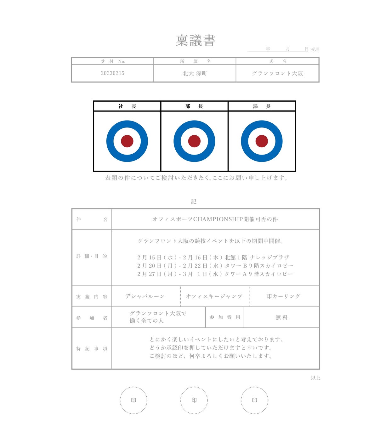 床には縦6m×横5.5mの巨大な稟議書が敷かれています。その稟議書はまだ承認前です。挑戦者は指定された位置からキャスター付きの印鑑型のストーンを滑らせ、課長、部長、社長の押印枠内で止めると得点をゲットできます。コツは狙いを定めてそーっと印鑑を押し出すことです。中心点に近いほど高得点になります。稟議書を作成する事も多い就業者としては、全員の承認を得ようとつい必死になってしまうこと間違いなしです。