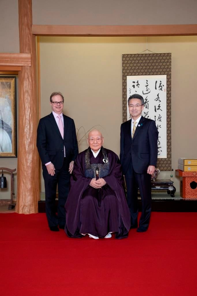 (写真:左から、ジェローム・シュシャン、南澤道人貫首、杉本達治福井県知事。)
