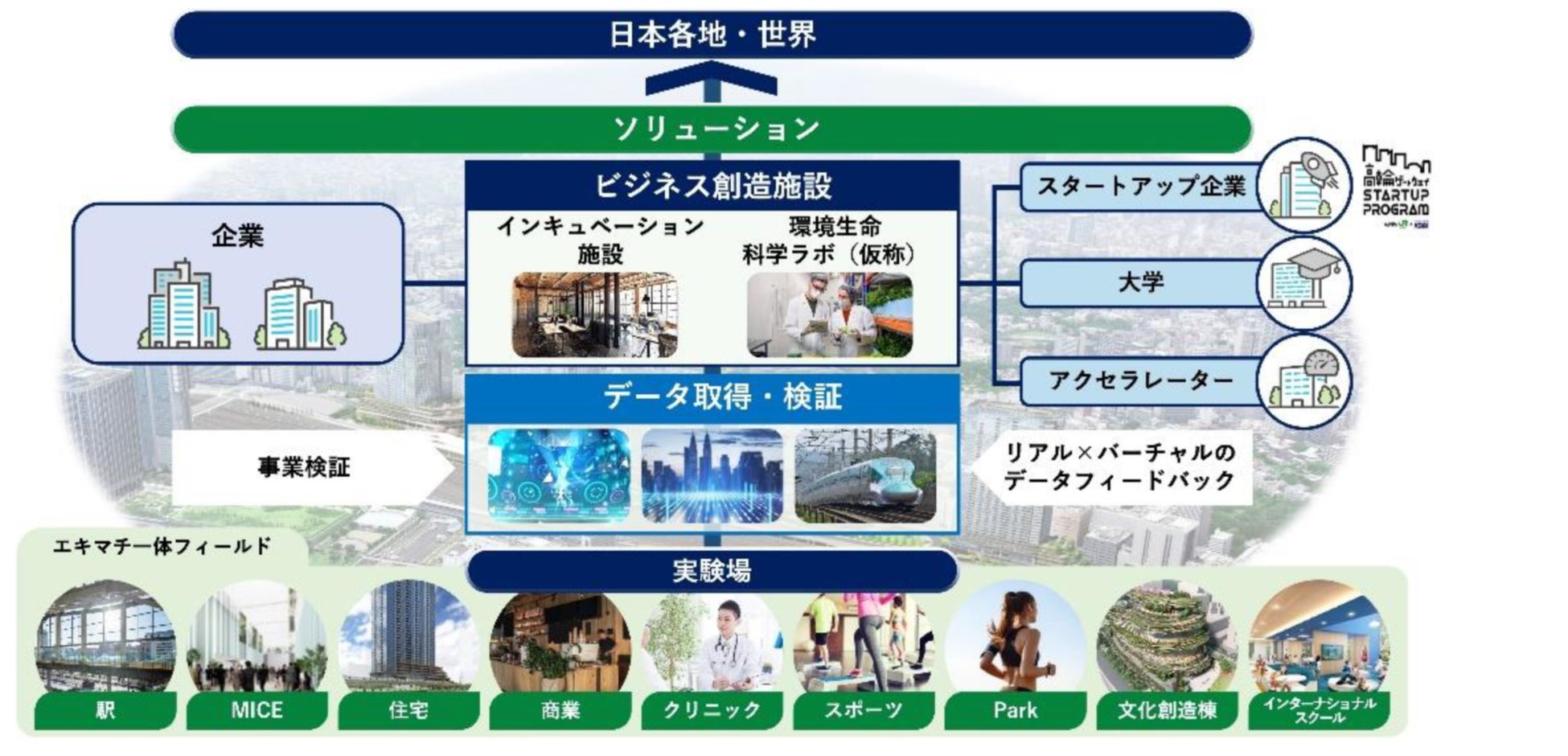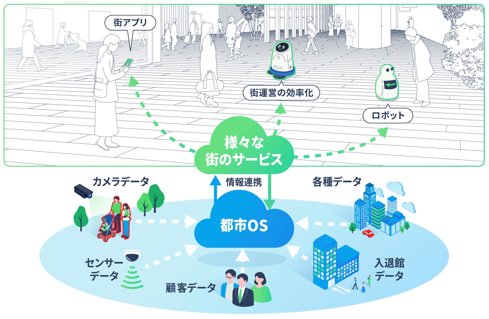 街の設備が持つデータを収集・分析するデータ基盤である「都市OS」の整備や、街から取得したデータを元にした仮想空間の中でのシミュレーションを可能にする「デジタルツイン」の導入により、多様なデータを掛け合わせたサービス創出や事業検証が可能になる実験場をともに創造します。