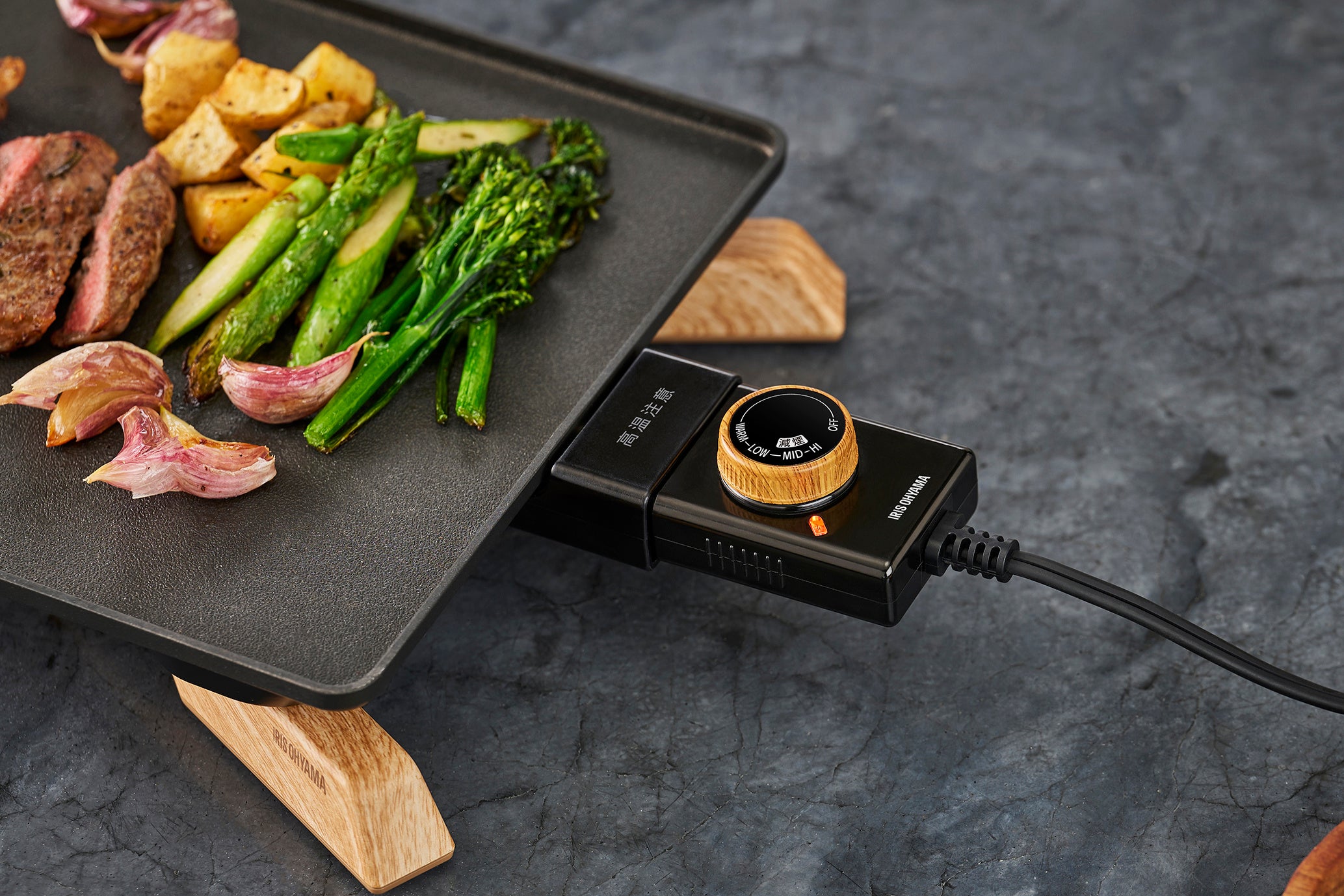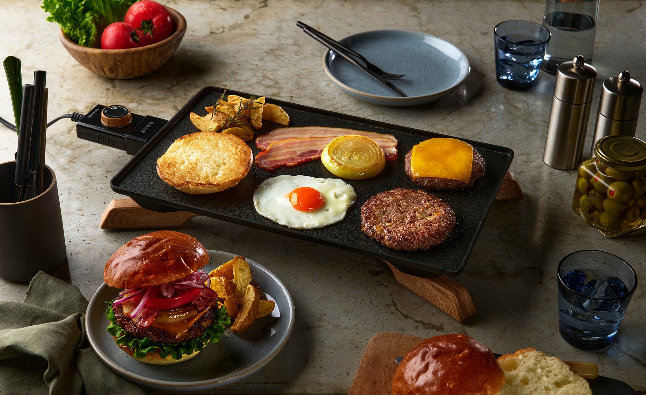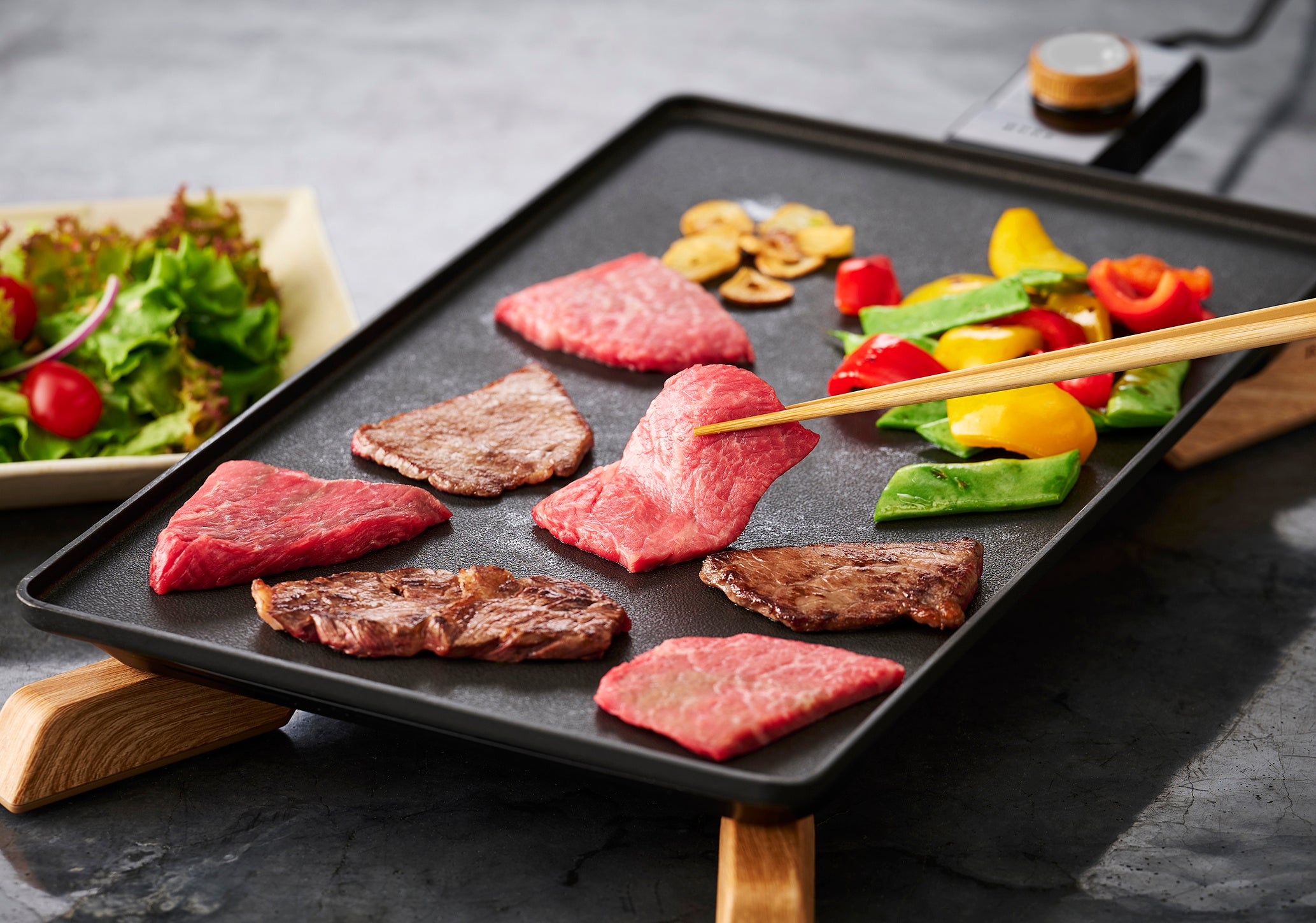 プレートは最も薄い部分が10mm(※3)、調理面のサイズは幅405mm×奥行245mm(※4)と、直径約19㎝のお好み焼きが2枚同時に焼ける大きさです。プレートにヒーターを内蔵することで、プレート温度を一定に保ち、肉など食材を均一に高火力で加熱できます。火力は、保温から高温(約80℃~230℃)まで無段階温度調節ができ、ステーキ、チーズフォンデュ、目玉焼きなど、家族との毎日の食事から友人と集まるパーティーまで多彩なシーンで活躍します。
