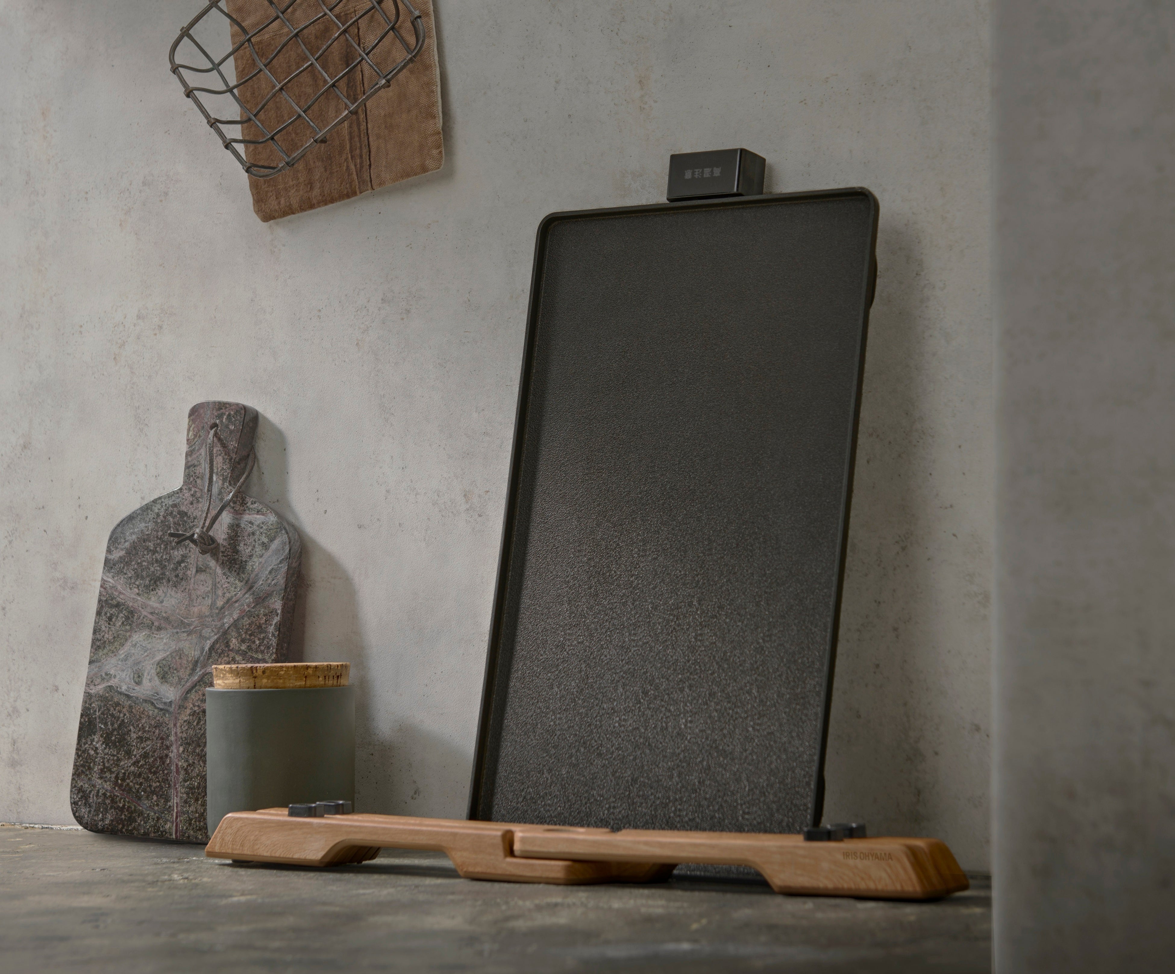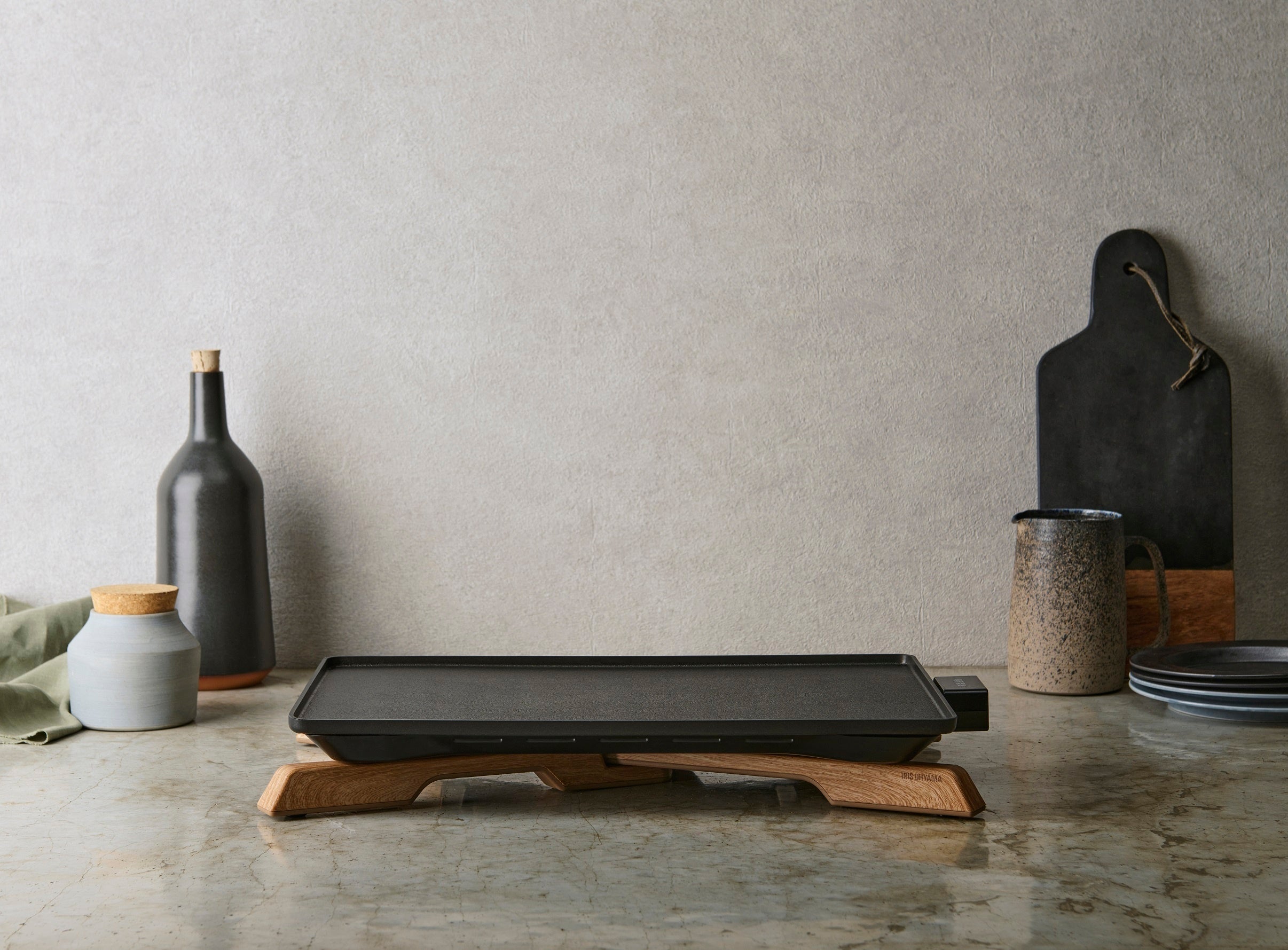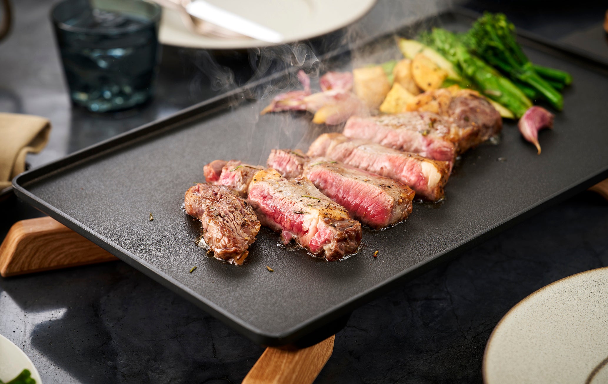 プレートは最も薄い部分が10mm(※3)、調理面のサイズは幅405mm×奥行245mm(※4)と、直径約19㎝のお好み焼きが2枚同時に焼ける大きさです。プレートにヒーターを内蔵することで、プレート温度を一定に保ち、肉など食材を均一に高火力で加熱できます。火力は、保温から高温(約80℃~230℃)まで無段階温度調節ができ、ステーキ、チーズフォンデュ、目玉焼きなど、家族との毎日の食事から友人と集まるパーティーまで多彩なシーンで活躍します。