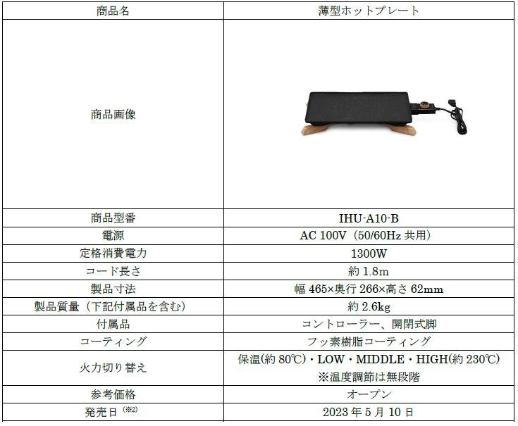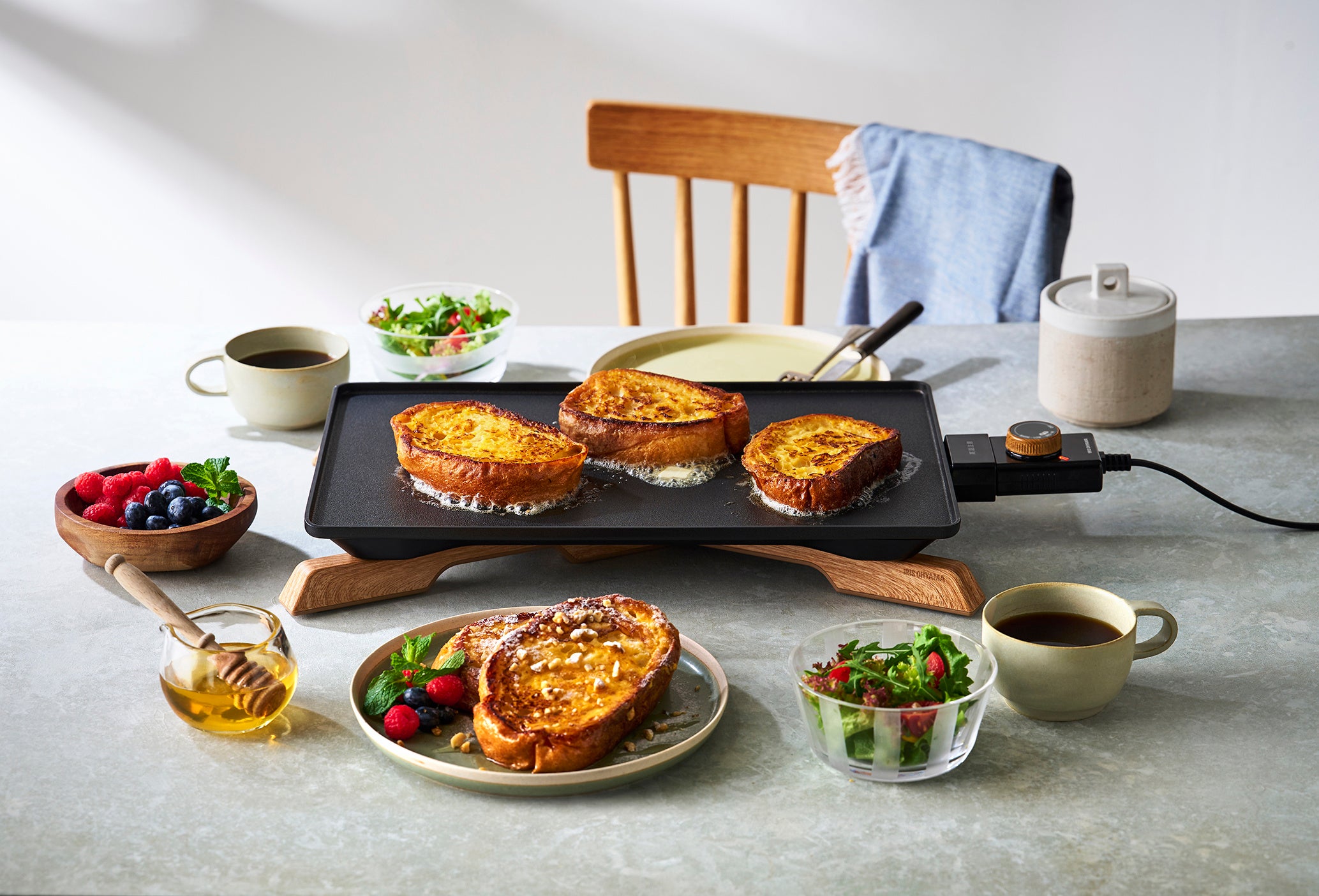 プレートは最も薄い部分が10mm(※3)、調理面のサイズは幅405mm×奥行245mm(※4)と、直径約19㎝のお好み焼きを2枚同時に焼ける大きさです。火力は、保温から高温(約80℃~230℃)まで無段階温度調節が可能です。プレートにヒーターを内蔵することでプレート温度を一定に保ち、食材を均一に高火力で加熱できます。プレートは丸洗いできるのでお手入れも容易です。本体質量は約2.6kg(※5)と軽量で出し入れしやすいので、フレンチトーストや目玉焼きなど毎日の食事にも手軽に使用できます。