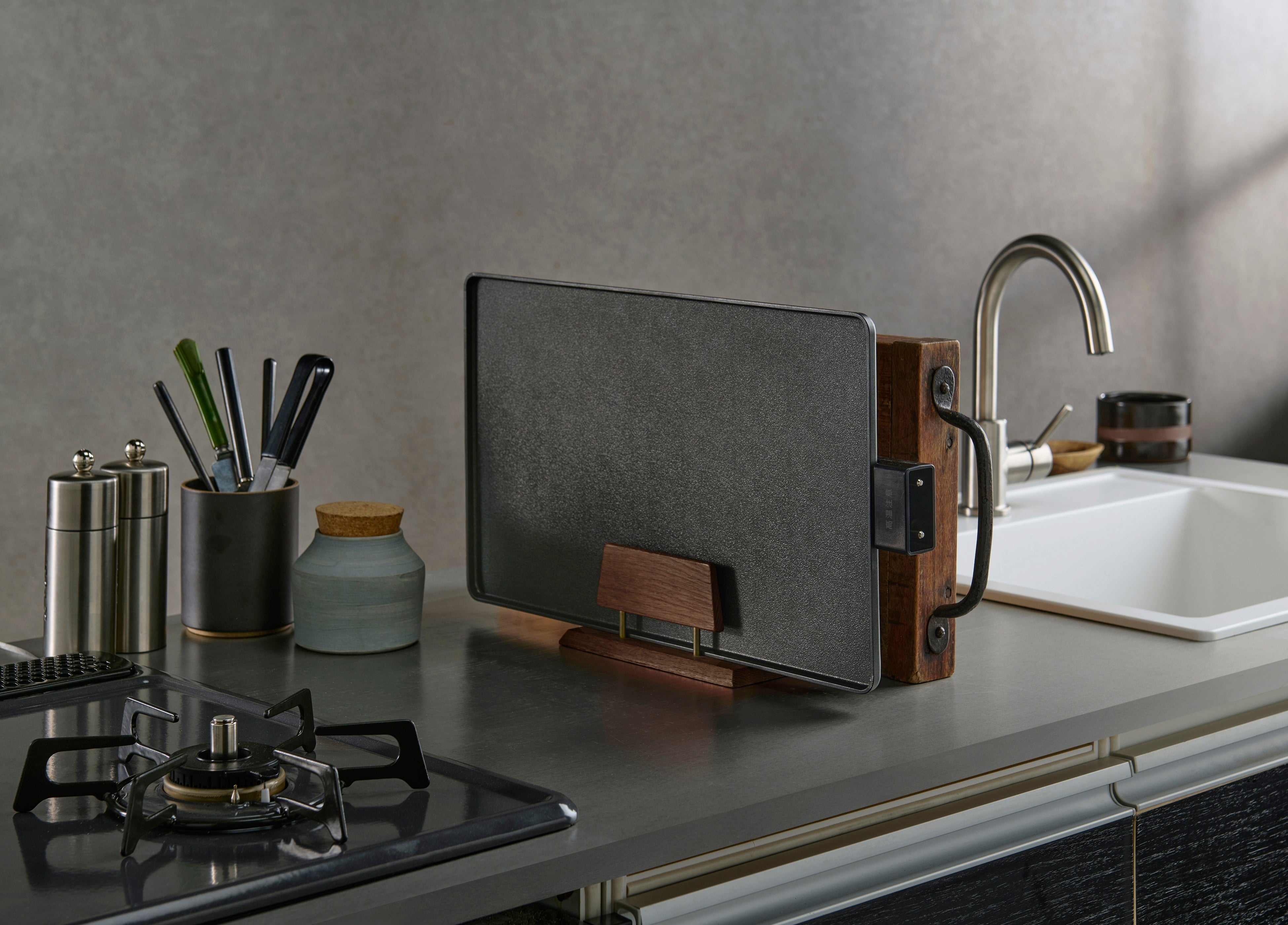 まな板スタンドなどに立てかけられる(※1)薄型プレートと折りたためるX型の脚により、狭い場所にも収納できます。ホットプレートの収納場所に困るという利用者の不満を解決します。