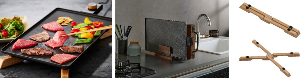 今回発売する「薄型ホットプレート」は、まな板スタンドなどに立てかけて収納できます(※1)。また、アウトドア用の鍋敷きや木の台をイメージしたプレートを置く脚は、温かみを感じる木目調と折りたためるX型のデザインを採用しており、料理を華やかに引き立てます。「自宅でもキャンプをしているような特別感や高揚感を感じてほしい」という開発コンセプトにより、家族や友人と一緒に食卓を囲み、自宅でキャンプをしているように会話を楽しみながら調理できます。