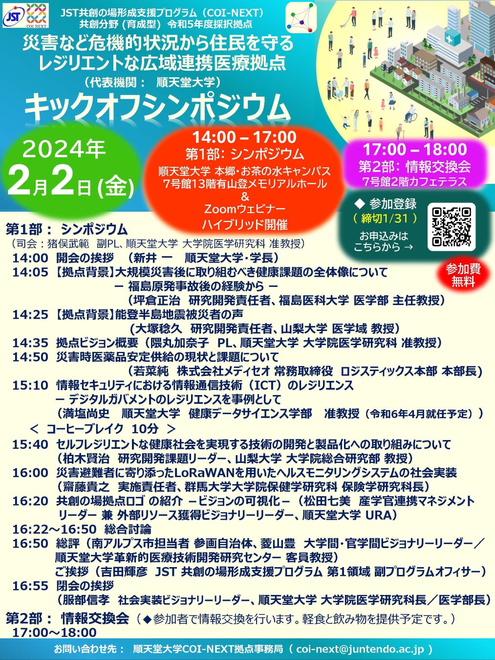 JST共創の場形成支援プログラム(COI-NEXT)共創分野(育成型)「災害など危機的状況から住民を守るレジリエントな広域連携医療拠点」キックオフシンポジウムを開催
