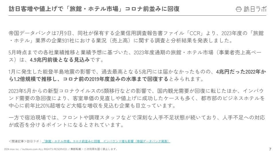訪日客増や値上げで「旅館・ホテル市場」コロナ前並みに回復