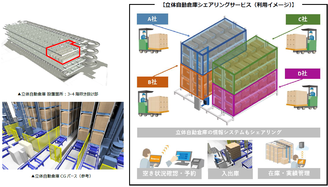 2024年問題に直面する物流業界では、ドライバーなど労働力不足が進む一方で、EC拡大により業務荷物量は増加傾向にあります。そのような中、物流業務支援のための自動化機器の導入を検討する企業は増加しておりますが、自動化機器の購入費用の負担が大きいことや導入までに時間がかかること等から導入実現には現状多くの課題が残っています。そうした課題の解決に向けて、本施設では立体自動倉庫の「シェアリングサービス」および自動化機器の「レンタルサービス」による、柔軟な物流業務提案を行い、更なる物流効率化の実現を目指します。