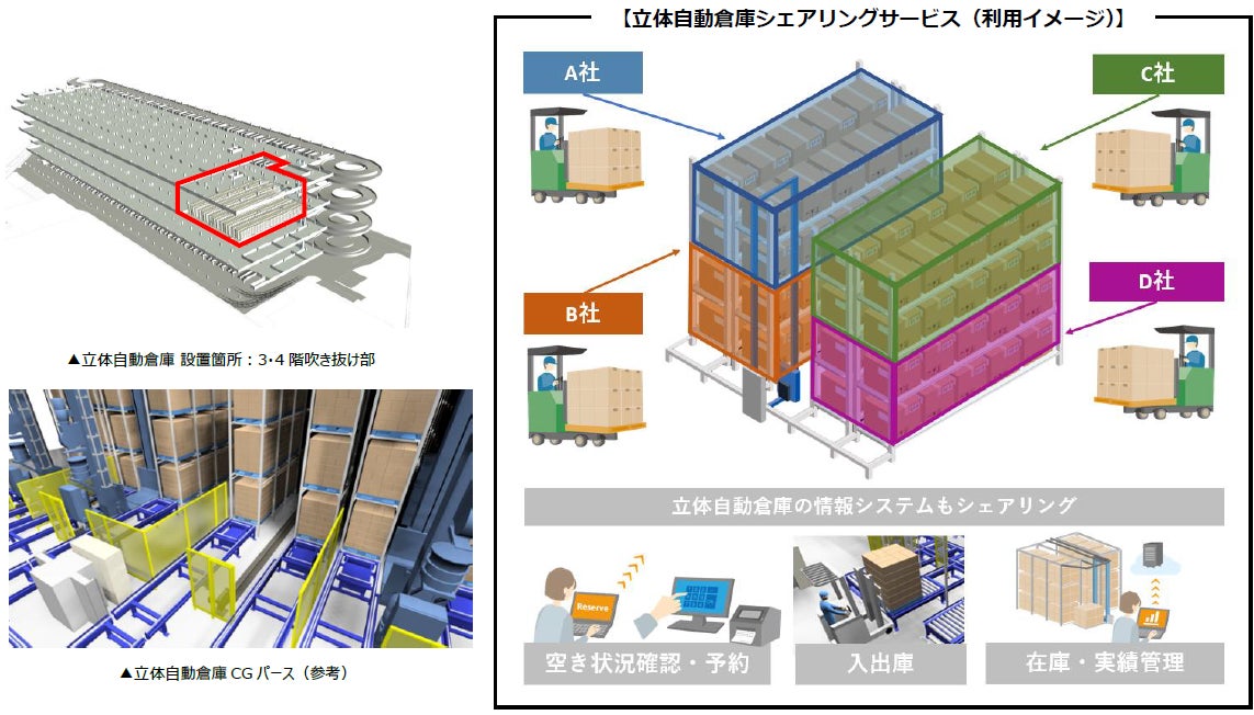 さらに、本施設では、立体自動倉庫を複数の入居テナントが共同利用できる「シェアリングサービス」を提供いたします。荷量に応じて任意の期間でパレット単位の予約ができ、柔軟な入出庫・保管が可能となります。各テナントが共通のシステム上で、空き情報の確認や事前予約、実績の照会などが可能な仕組みです。