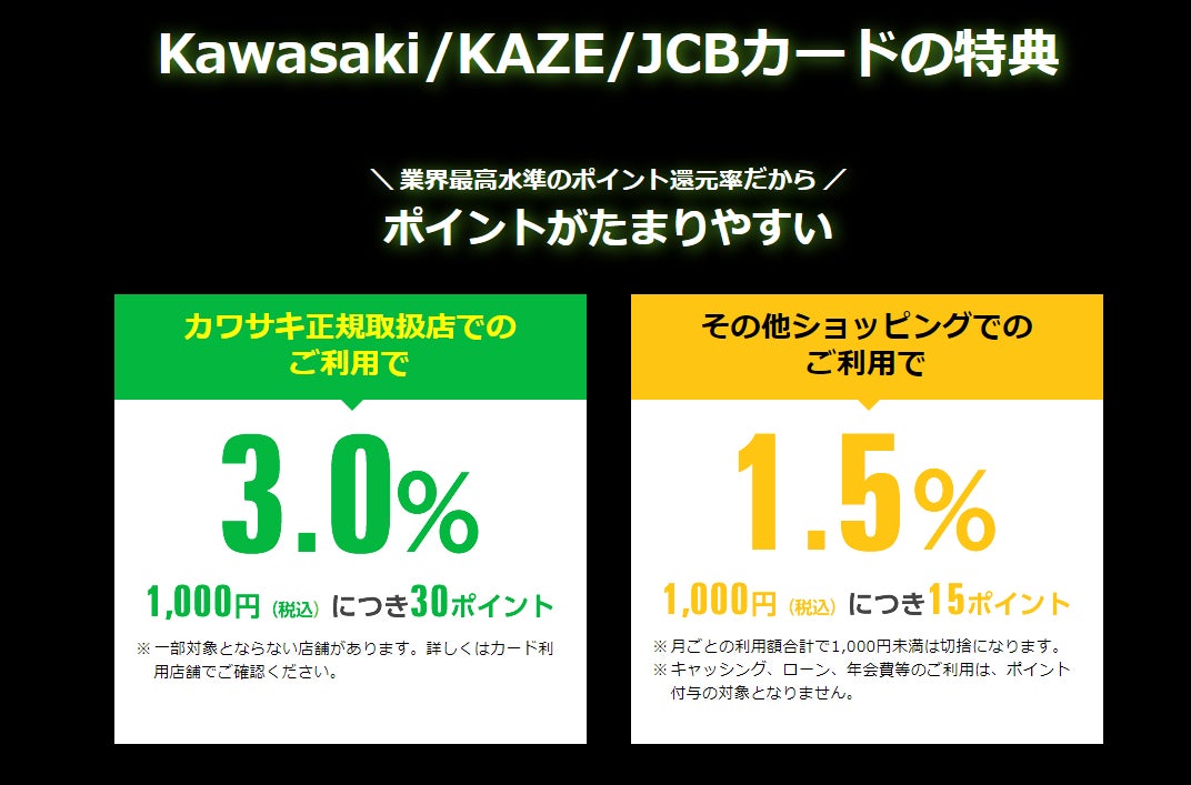 カワサキモーターサイクルやジェットスキーをさらに深く楽しめる、カワサキのライダーズクラブ「KAZE」では会員カードとクレジットカードが一体となった「KAZE/JCBカード」で新規入会キャンペーンを実施中です。2024年9月30日までに新たにKAZE/JCBカードをお申込みいただくと、もれなく2,000ポイントをプレゼント!カワサキ正規取扱店(一部対象外の店舗があります)でのご利用で1,000円ごとに30ポイント、それ以外でのショッピングでも1,000円ごとに15ポイントが付く上に、KAZEのイベントや提携施設でも割引などの優待が受けることができてとってもお得です。ポイントは5,000ポイント以上でキャッシュバックやカタログ商品との交換にご利用いただけます。