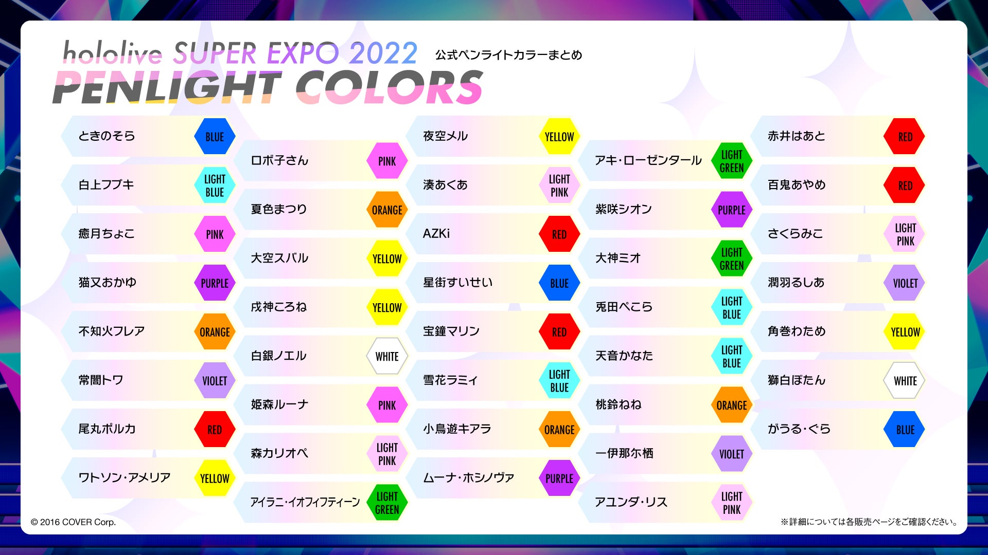 ときのそら / ロボ子さん / 夜空メル / アキ・ローゼンタール / 湊あくあ / 紫咲シオン / 百鬼あやめ / 癒月ちょこ / 大神ミオ / 猫又おかゆ / 兎田ぺこら / 潤羽るしあ / 不知火フレア / 角巻わため/ 雪花ラミィ / 獅白ぼたん / アユンダ・リス / アイラニ・イオフィフティーン / 森カリオペ / 小鳥遊キアラ