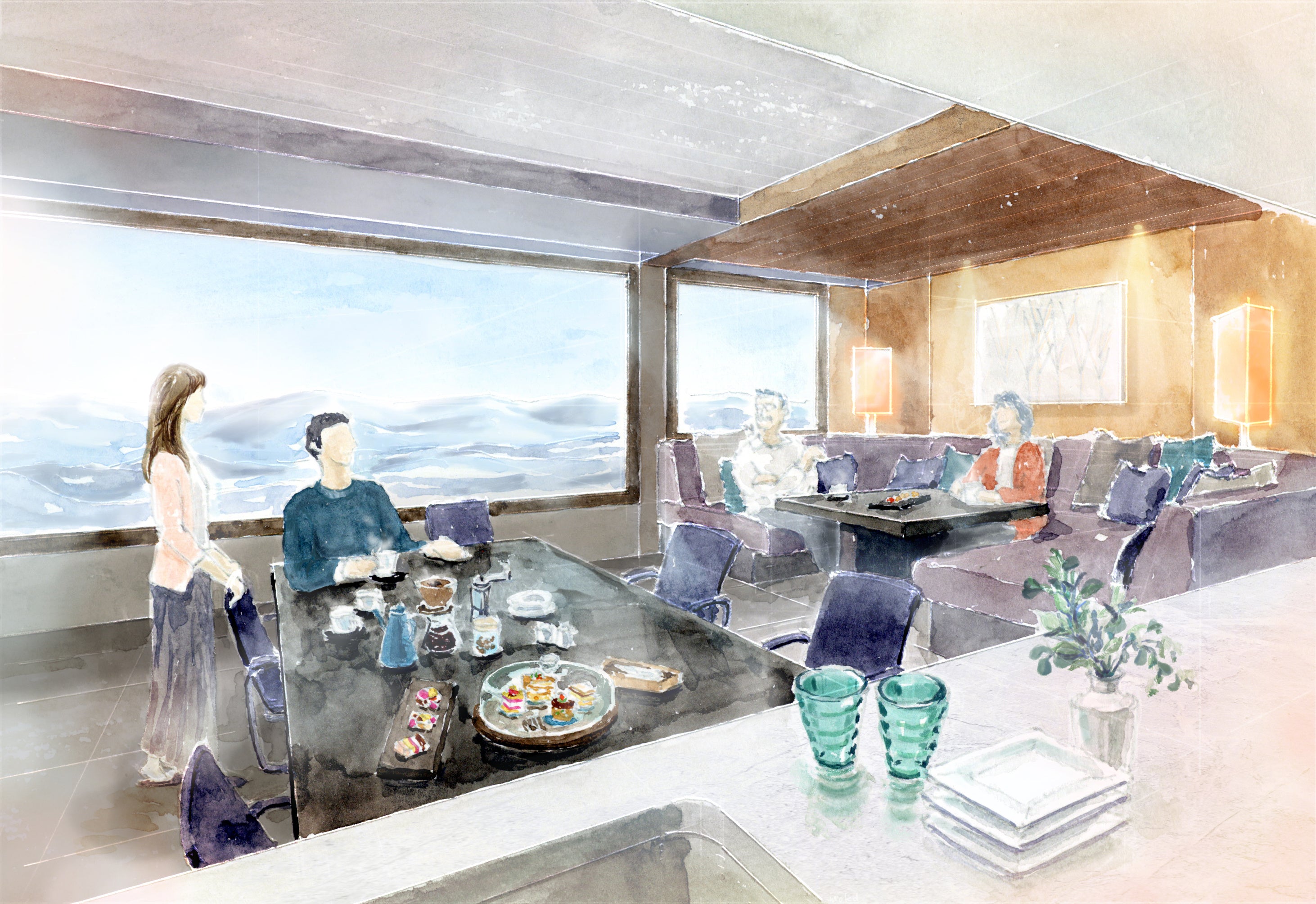 全室に独立したキッチンとリビングダイニングを備え、長期間の滞在でも快適に過ごすことができる客室です。食事は調理スタッフが下準備を済ませた状態で客室へ届けられ、簡単な行程で本格的な料理を楽しめるギャザリングサービスを用意します。時間にとらわれず、プライベート空間でゆったりと食事を楽しむことができる、食事スタイルです。