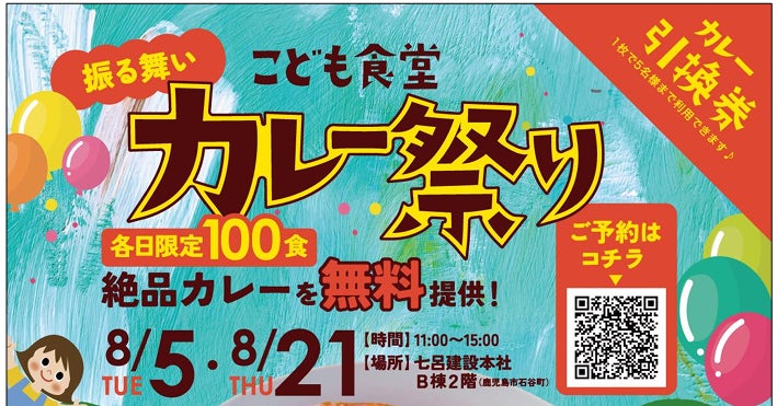 カレー大學卒業生が大活躍!給食のない夏休み中の「昼食難民」のこどもを救うべく鹿児島の住宅メーカーの七呂建設が「こども食堂」を 開催。カレーを無償で振る舞い100食が完売し大好評! 次回は8月21日開催