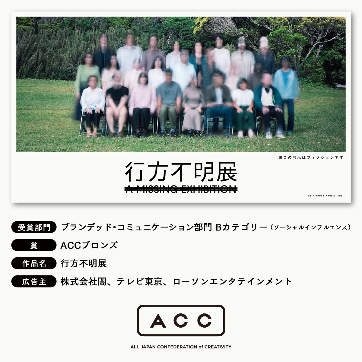 ホラー作家・梨、株式会社闇、テレビ東京プロデューサー・大森時生が企画・制作を手がけた作品『行方不明展』が、一般社団法人ACCの主催する「2025 65th ACC TOKYO CREATIVITY AWARDS」において、ブランデッド・コミュニケーション部門Bカテゴリー(ソーシャルインフルエンス)の「ACCブロンズ」を受賞いたしました。
