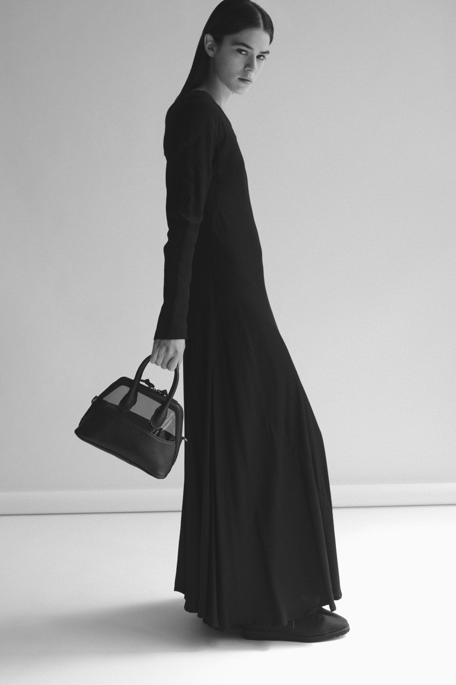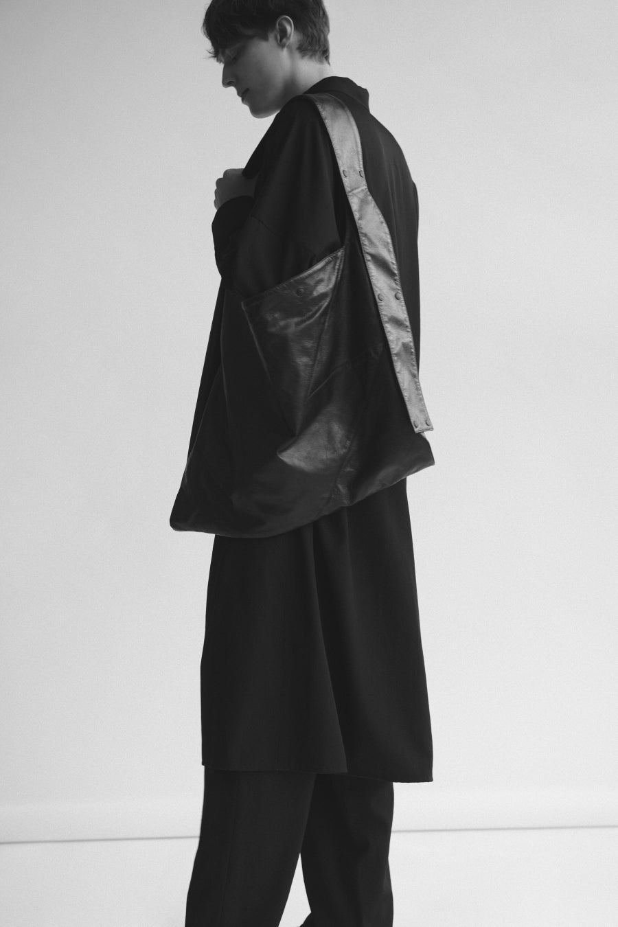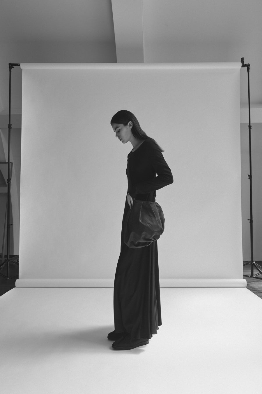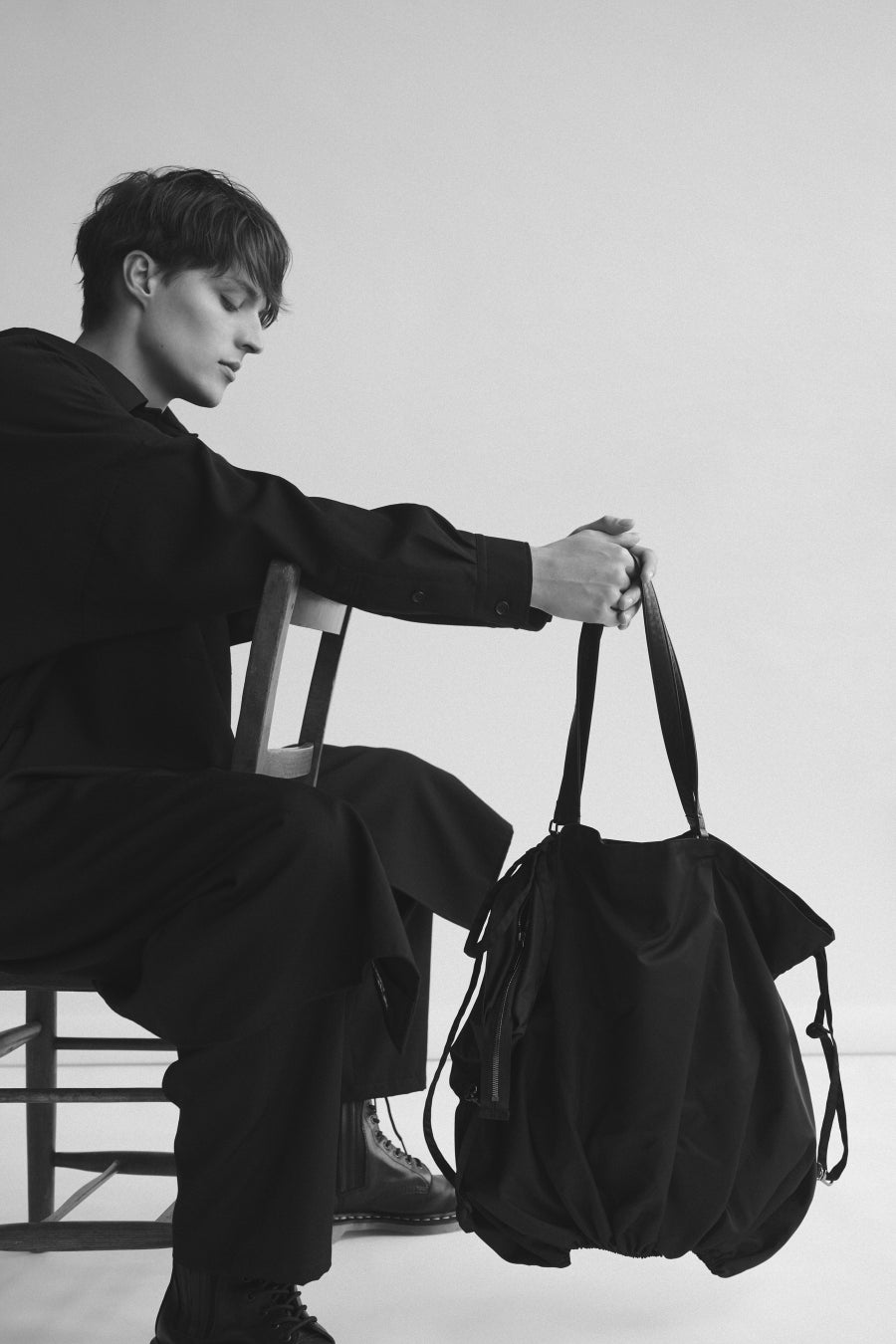 Yohji Yamamotoのドレスからインスピレーションを受けた「Coquillage」。2024春夏コレクションのシグネチャー・モデル。ネックラインのタブに紐が通され、裾のギャザーでバルーンスカートのようになったドレスの造形から紐解かれた貝殻のような有機的且つ規則性を感じさせるユニークなディテール。ナイロン素材のシルエット。