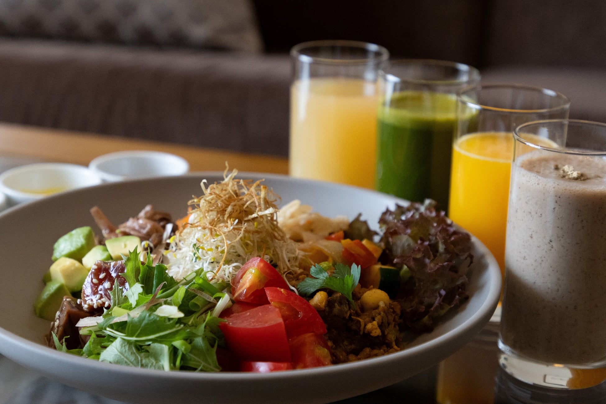 ■帝国ホテル特製の朝食をご用意。肌分析結果に合わせたおすすめのスムージーをご選択いただけます。
