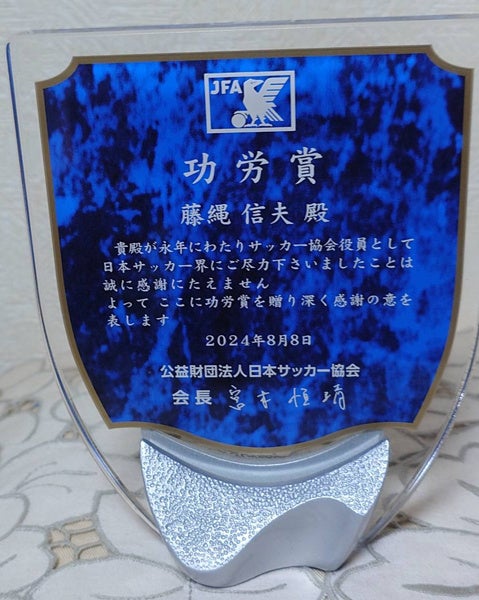 先日、永年にわたりサッカー協会役員として、日本サッカー界に尽力されたことに対して、公益財団法人日本サッカー協会より、前大阪府サッカー協会会長であるFC大阪 藤縄信夫クラブキャプテンへ功労賞が授与されましたのでお知らせいたします。