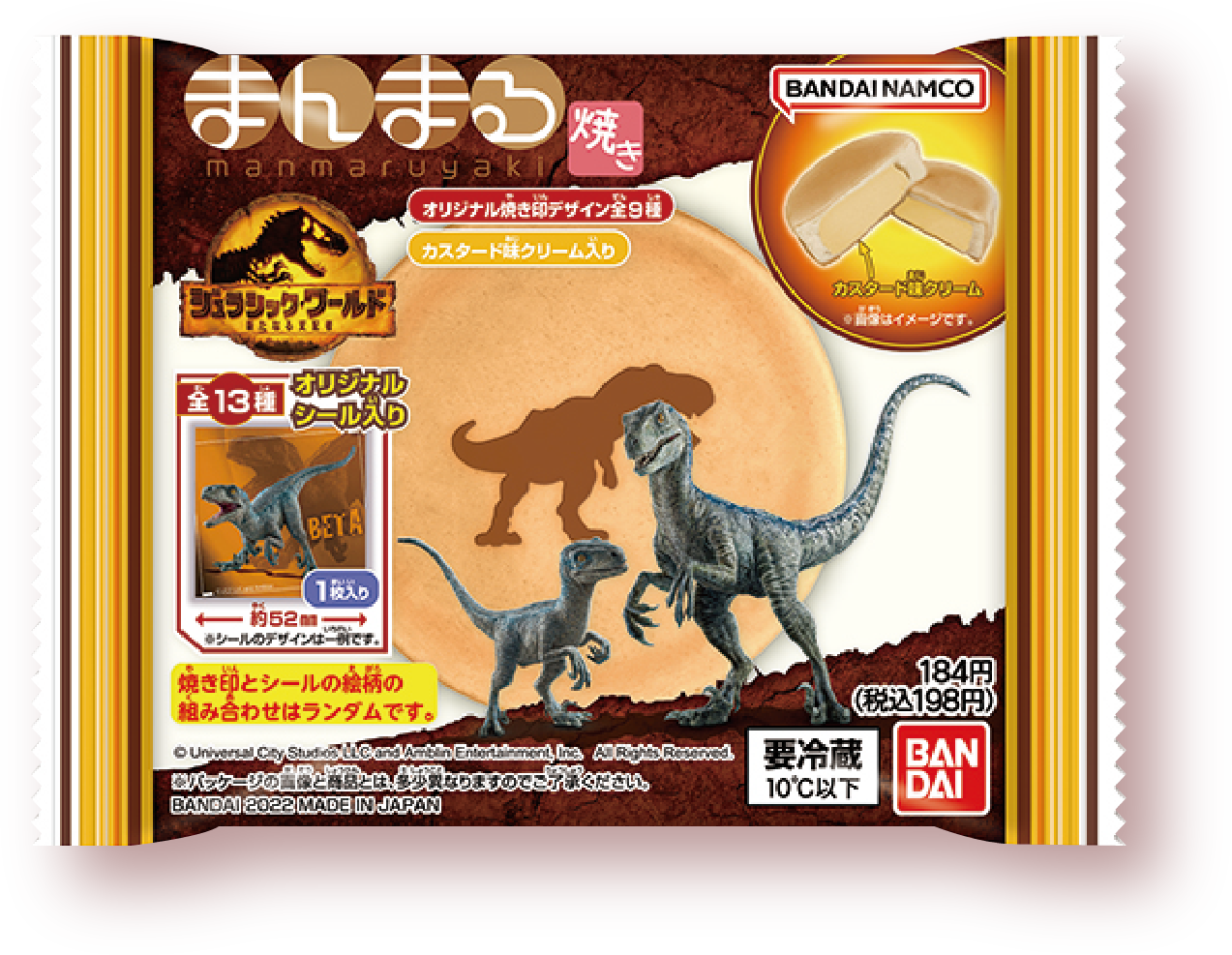 【内容】ふわふわの生地の中にカスタード味のクリームが詰まったまんまる焼きです。表面には恐竜の焼き印(全9種類)が入っており、オリジナルシール(全13種類 内シークレット1種類)入りの商品です。