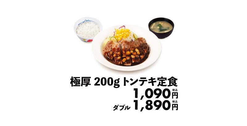 商品名 極厚200Gトンテキ定食 1,090円/(W)1,890円 ※お持ち帰りいただけます。お持ち帰りにみそ汁は付きません。 お持ち帰りの場合、みそ汁は別途60円でお求めいただけます。 ※税込み価格です。 ※株主優待券は「極厚200gトンテキ定食」にご使用いただけます。 「ダブル定食」にはご使用いただけません。 発売日 2024年6月11日(火)午前10時 ~ 対象店舗 一部店舗を除く全国の松屋 |